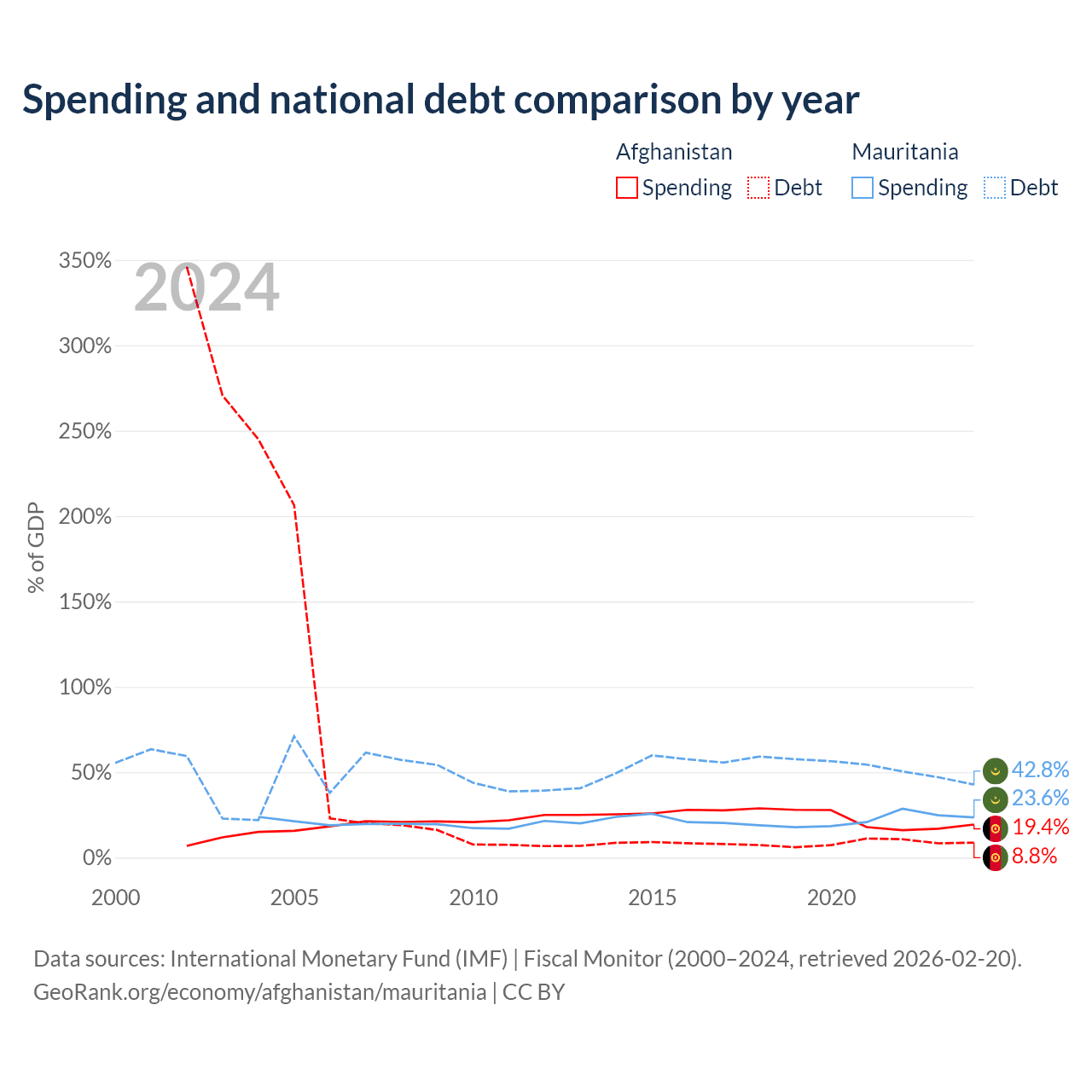 Afghanistan has $1.44B in government debt (8.8% of GDP), compared to $4.67B (42.8% of GDP) in Mauritania.