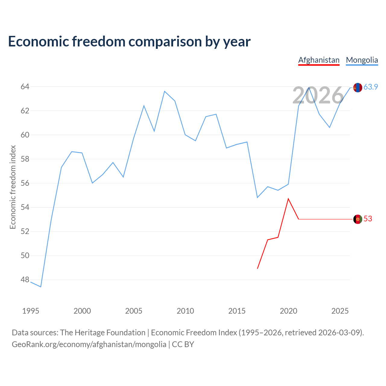 The Economic Freedom Index for Afghanistan is 53, ranking 142/197, compared to 63.9 for Mongolia, ranking 76/197. The chart above displays a comparison of annual changes in economic freedom indexes.