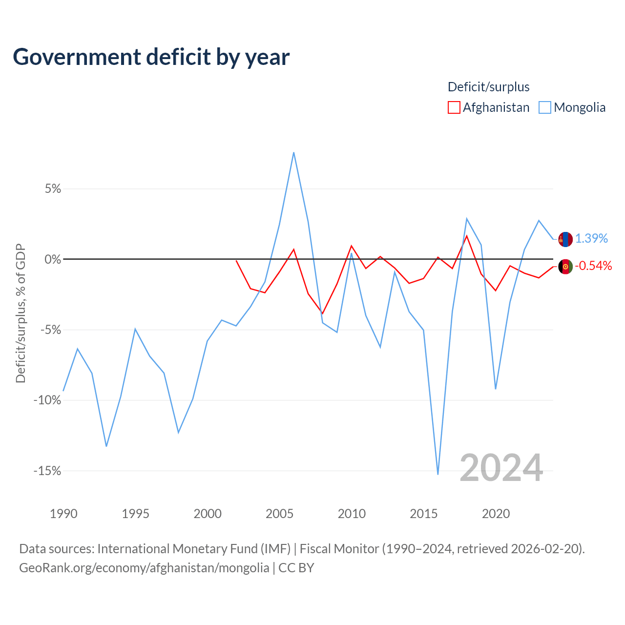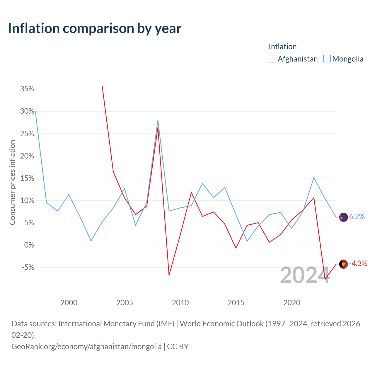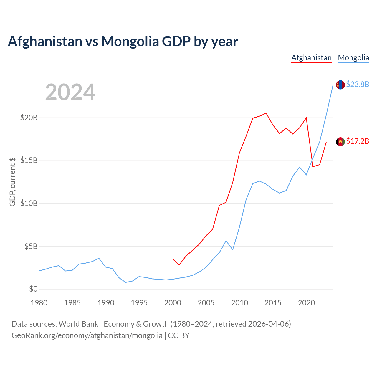 Afghanistan has a GDP of $17.2B compared to $23.8B for Mongolia, ranking 137/197 and 121/197 by economy size, respectively.