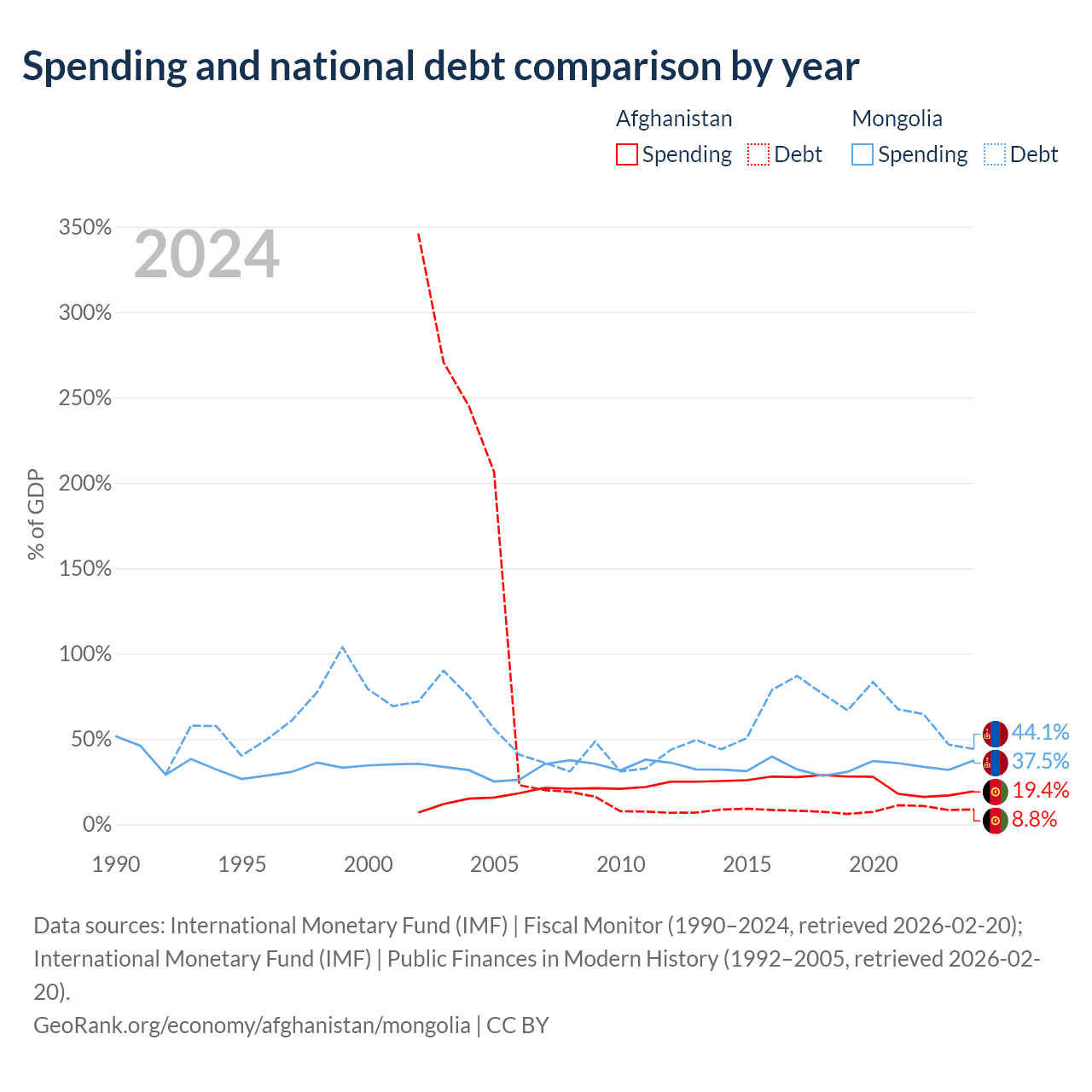 Afghanistan has $1.44B in government debt (8.8% of GDP), compared to $10.5B (44.1% of GDP) in Mongolia.