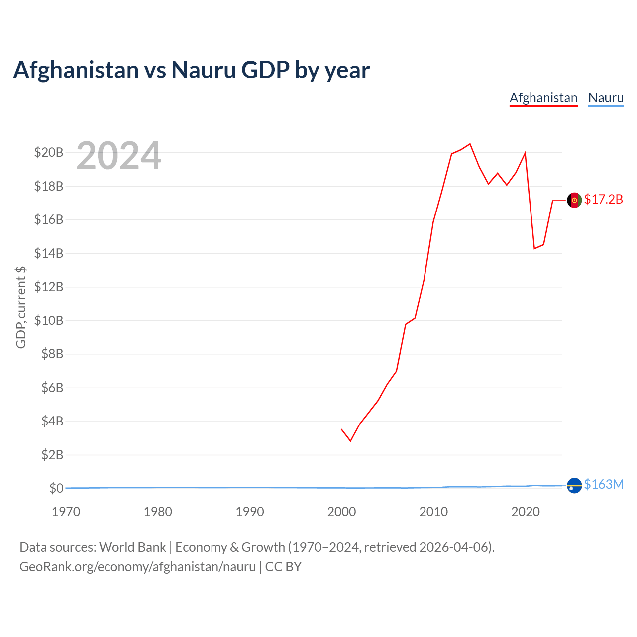 Afghanistan has a GDP of $17.2B compared to $163M for Nauru, ranking 137/197 and 195/197 by economy size, respectively.