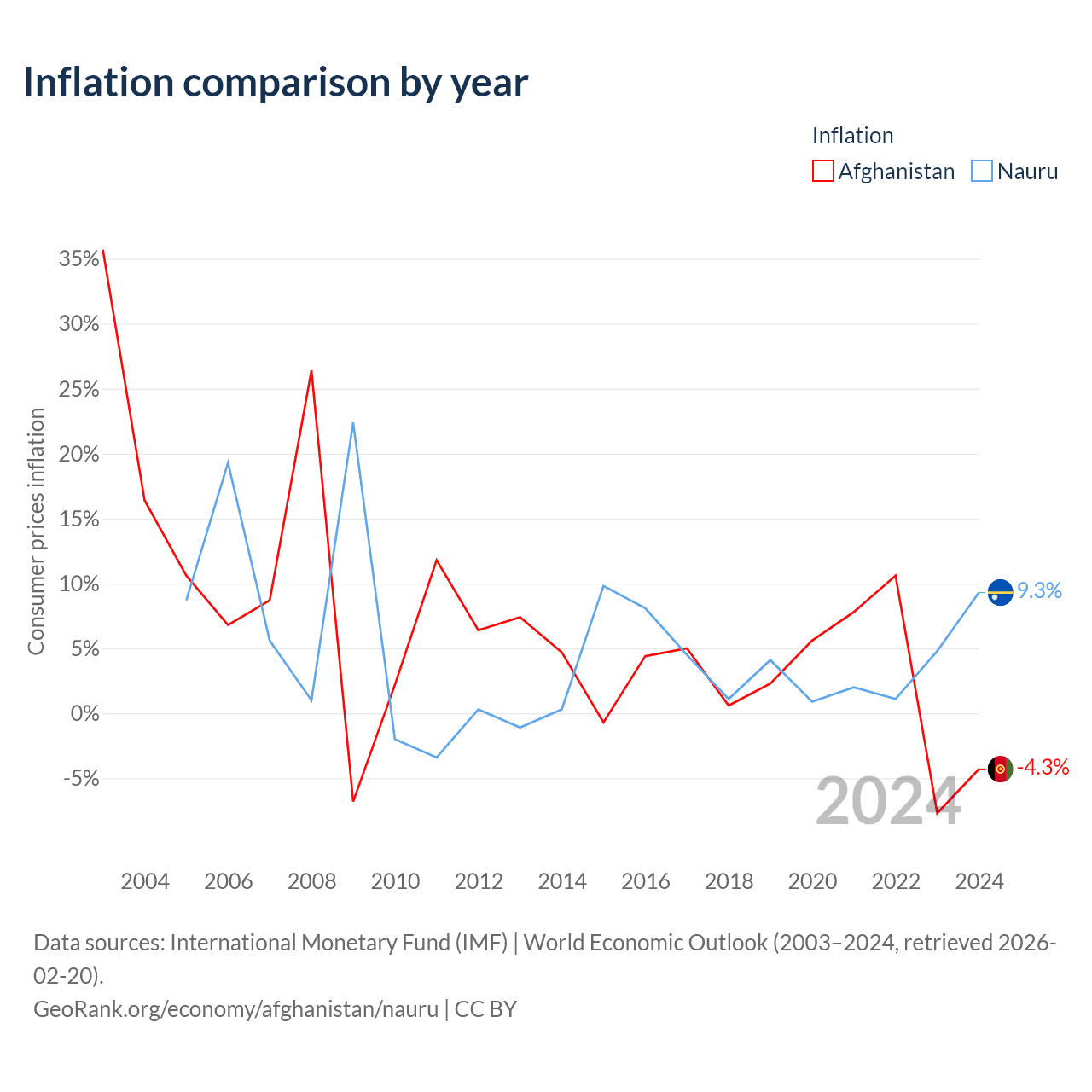 Over the past 20 years, Afghanistan has recorded an average annual inflation rate of 5.09%, compared with 4.84% in Nauru. In 2024, inflation was -4.3% in Afghanistan and 9.3% in Nauru.