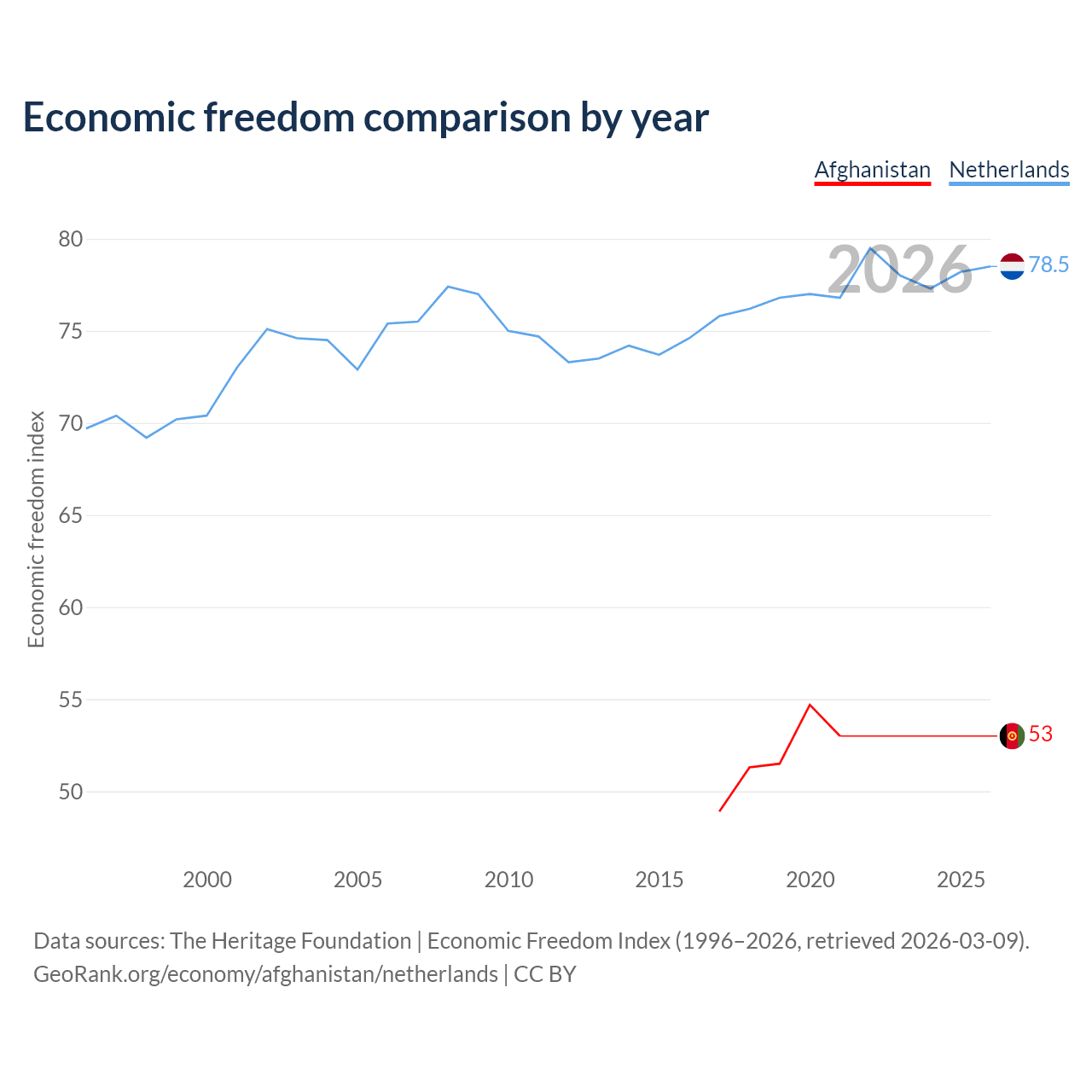 The Economic Freedom Index for Afghanistan is 53, ranking 142/197, compared to 78.5 for the Netherlands, ranking 11/197. The chart above displays a comparison of annual changes in economic freedom indexes.