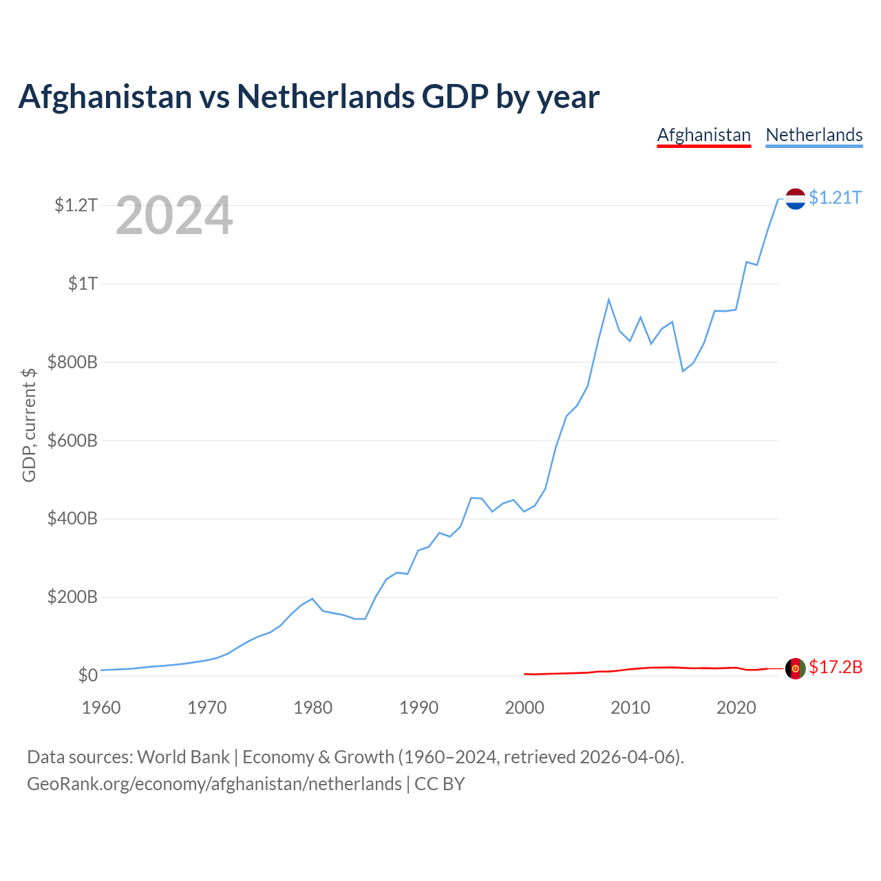 Afghanistan has a GDP of $17.2B compared to $1.21T for the Netherlands, ranking 137/197 and 19/197 by economy size, respectively.