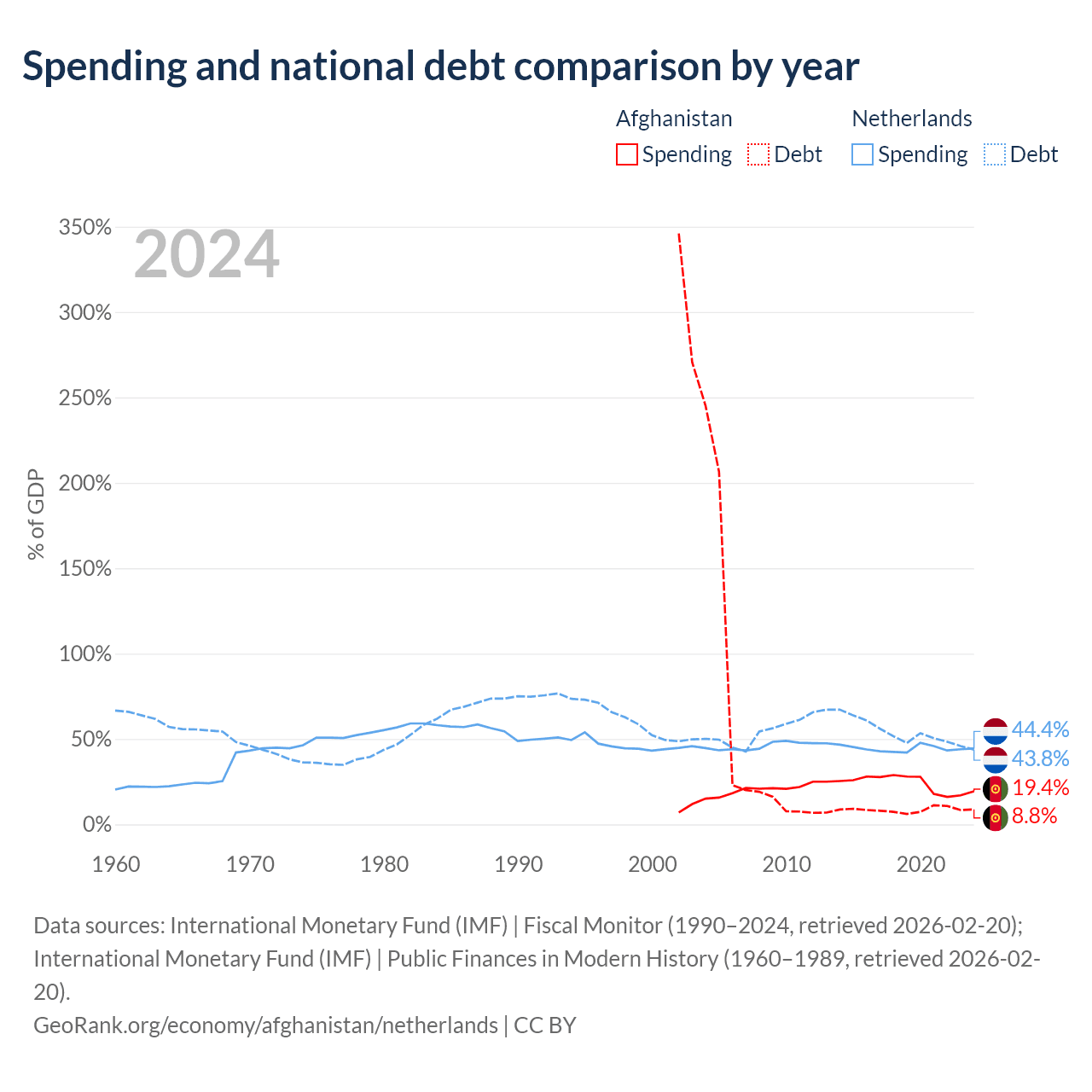 Afghanistan has $1.44B in government debt (8.8% of GDP), compared to $532B (43.8% of GDP) in the Netherlands.