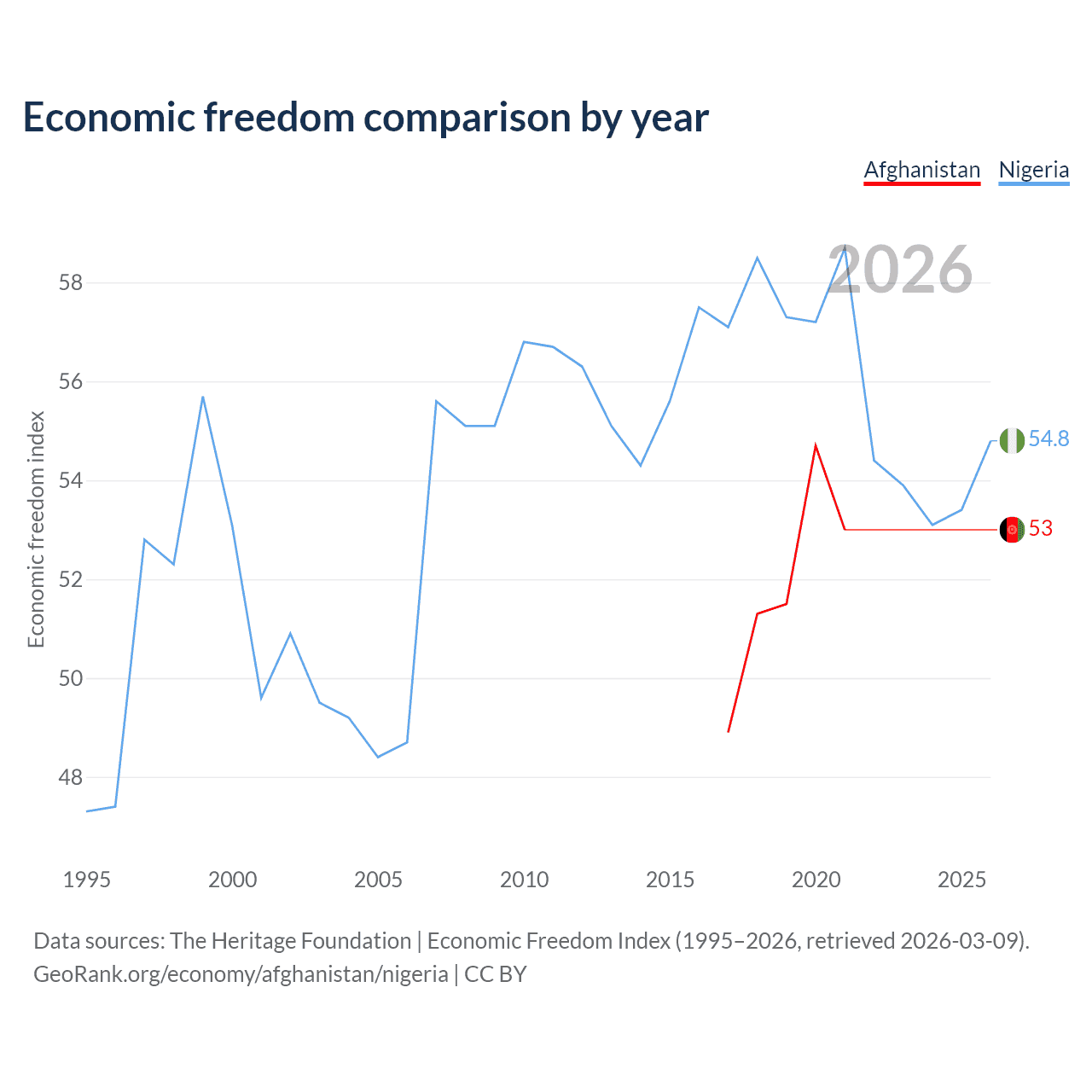 The Economic Freedom Index for Afghanistan is 53, ranking 142/197, compared to 54.8 for Nigeria, ranking 132/197. The chart above displays a comparison of annual changes in economic freedom indexes.