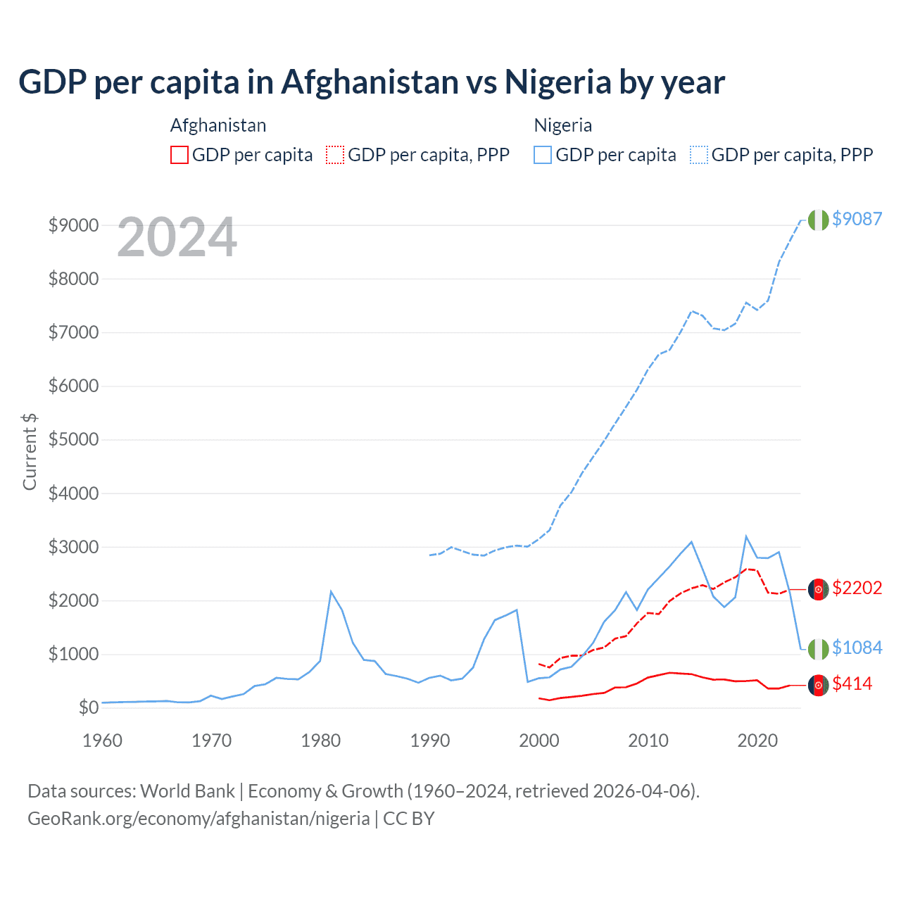 GDP per capita in Afghanistan vs Nigeria by year