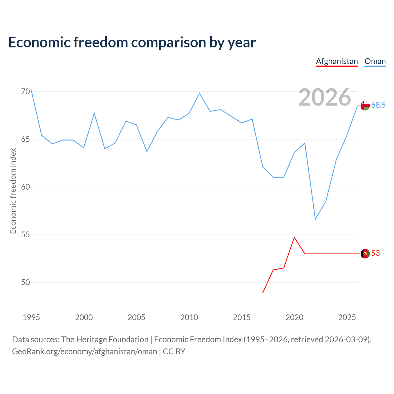 The Economic Freedom Index for Afghanistan is 53, ranking 142/197, compared to 68.5 for Oman, ranking 45/197. The chart above displays a comparison of annual changes in economic freedom indexes.