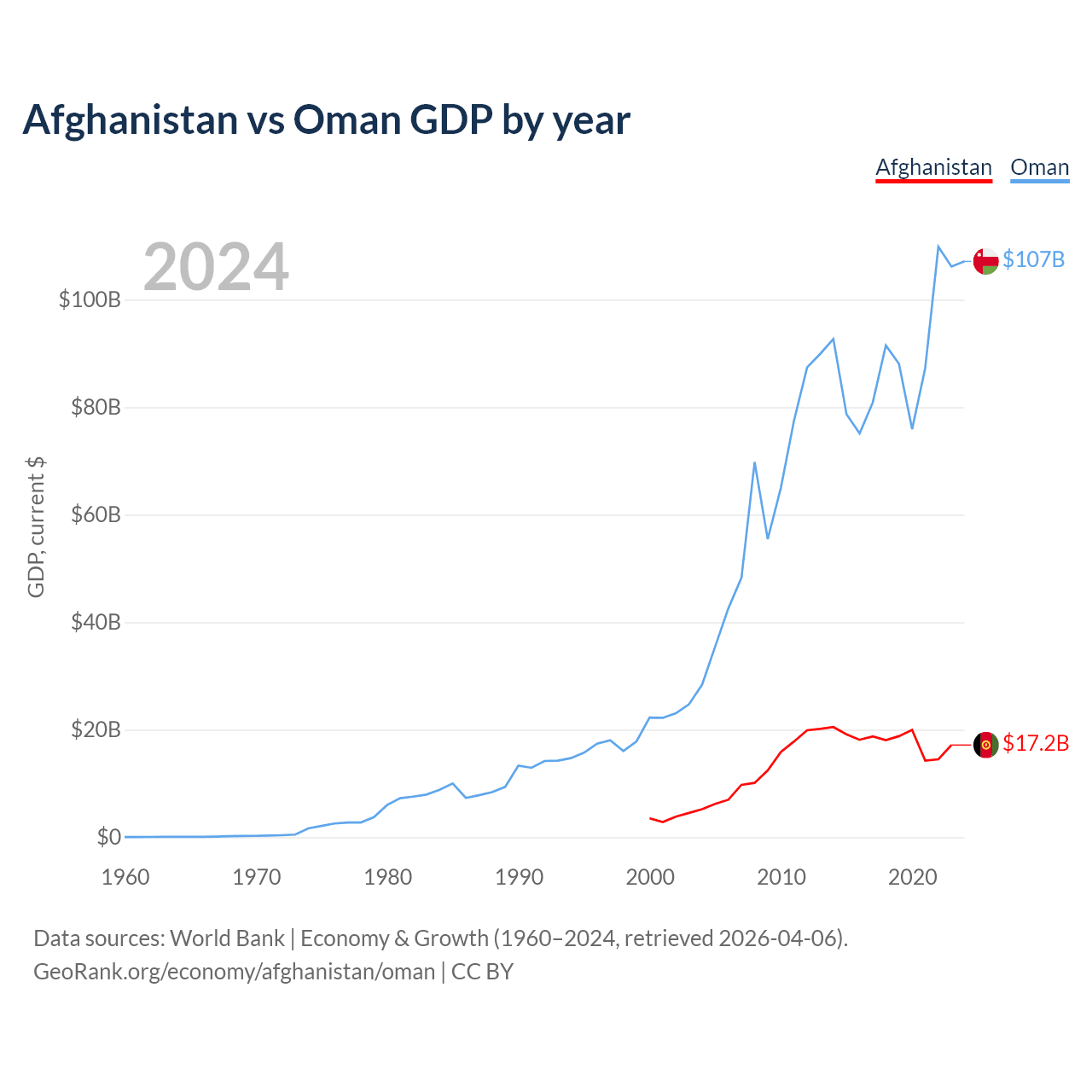 Afghanistan has a GDP of $17.2B compared to $107B for Oman, ranking 137/197 and 70/197 by economy size, respectively.