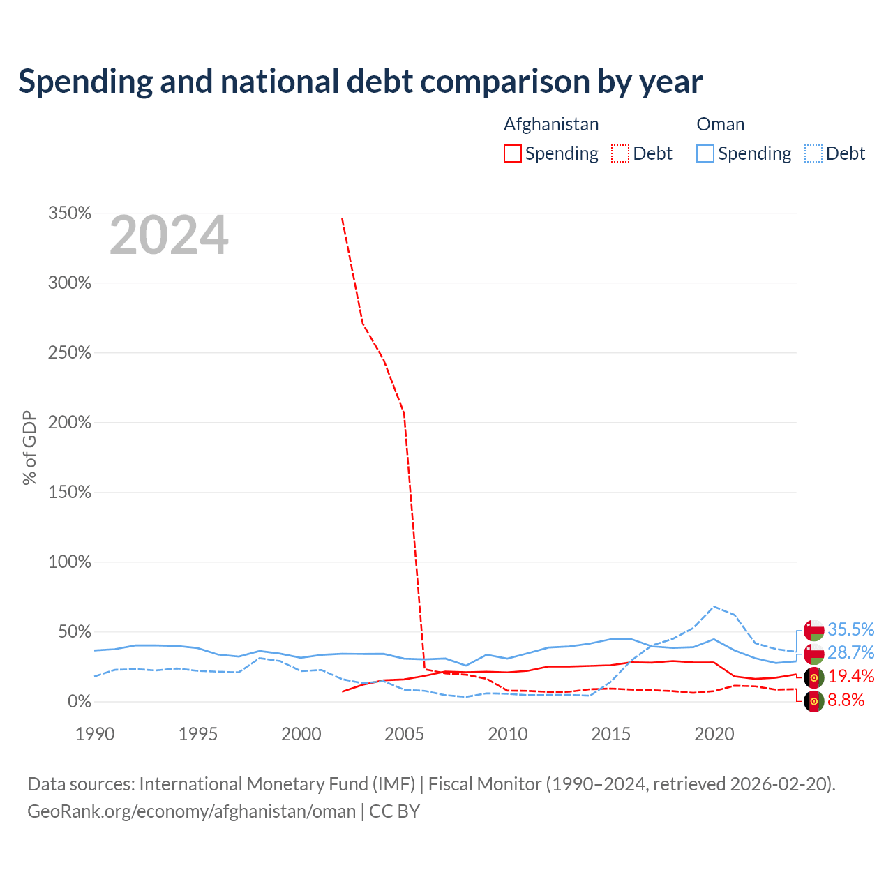 Afghanistan has $1.44B in government debt (8.8% of GDP), compared to $38B (35.5% of GDP) in Oman.