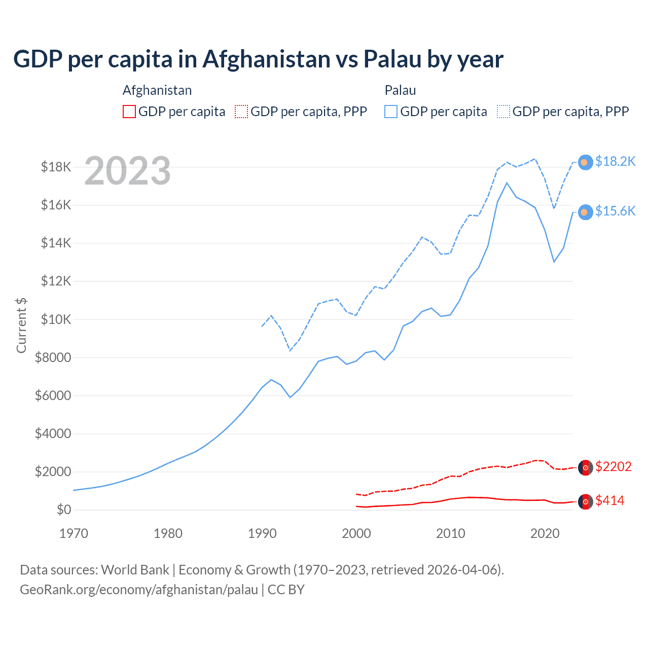 GDP per capita in Afghanistan vs Palau by year