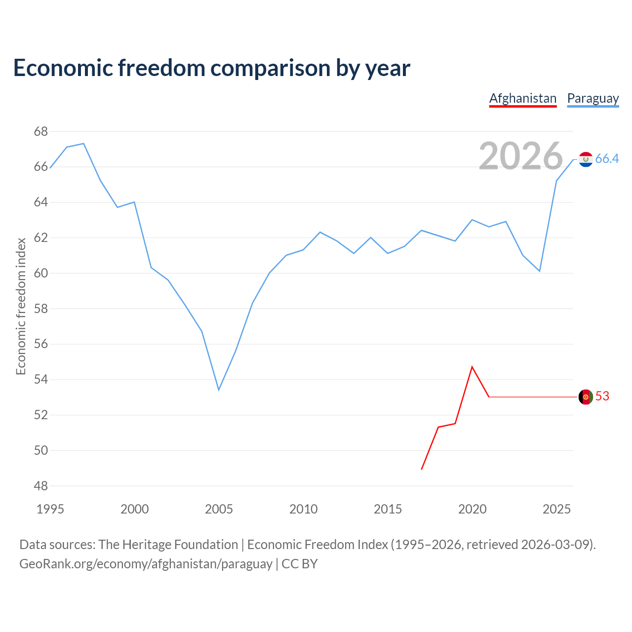 The Economic Freedom Index for Afghanistan is 53, ranking 142/197, compared to 66.4 for Paraguay, ranking 61/197. The chart above displays a comparison of annual changes in economic freedom indexes.