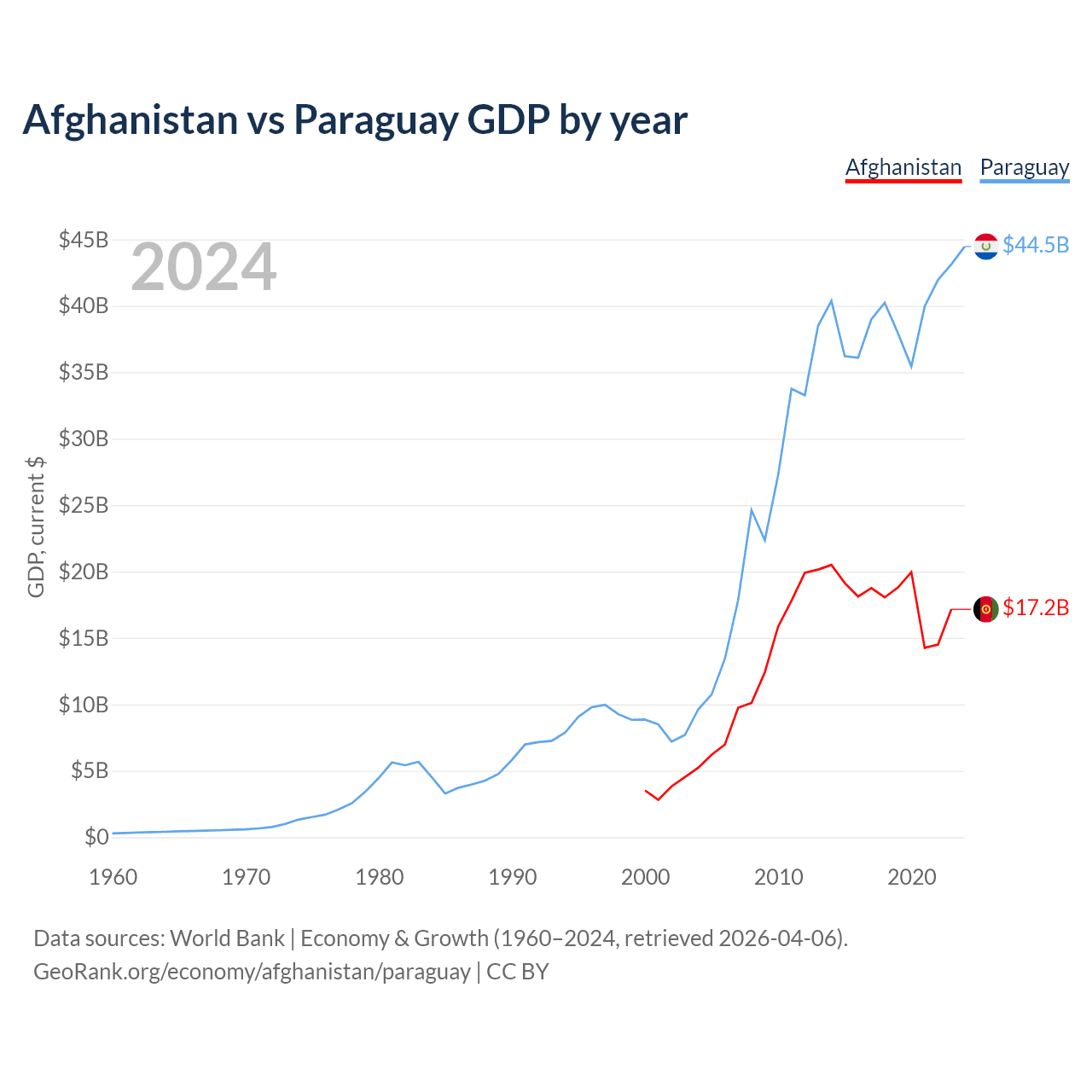 Afghanistan has a GDP of $17.2B compared to $44.5B for Paraguay, ranking 137/197 and 98/197 by economy size, respectively.