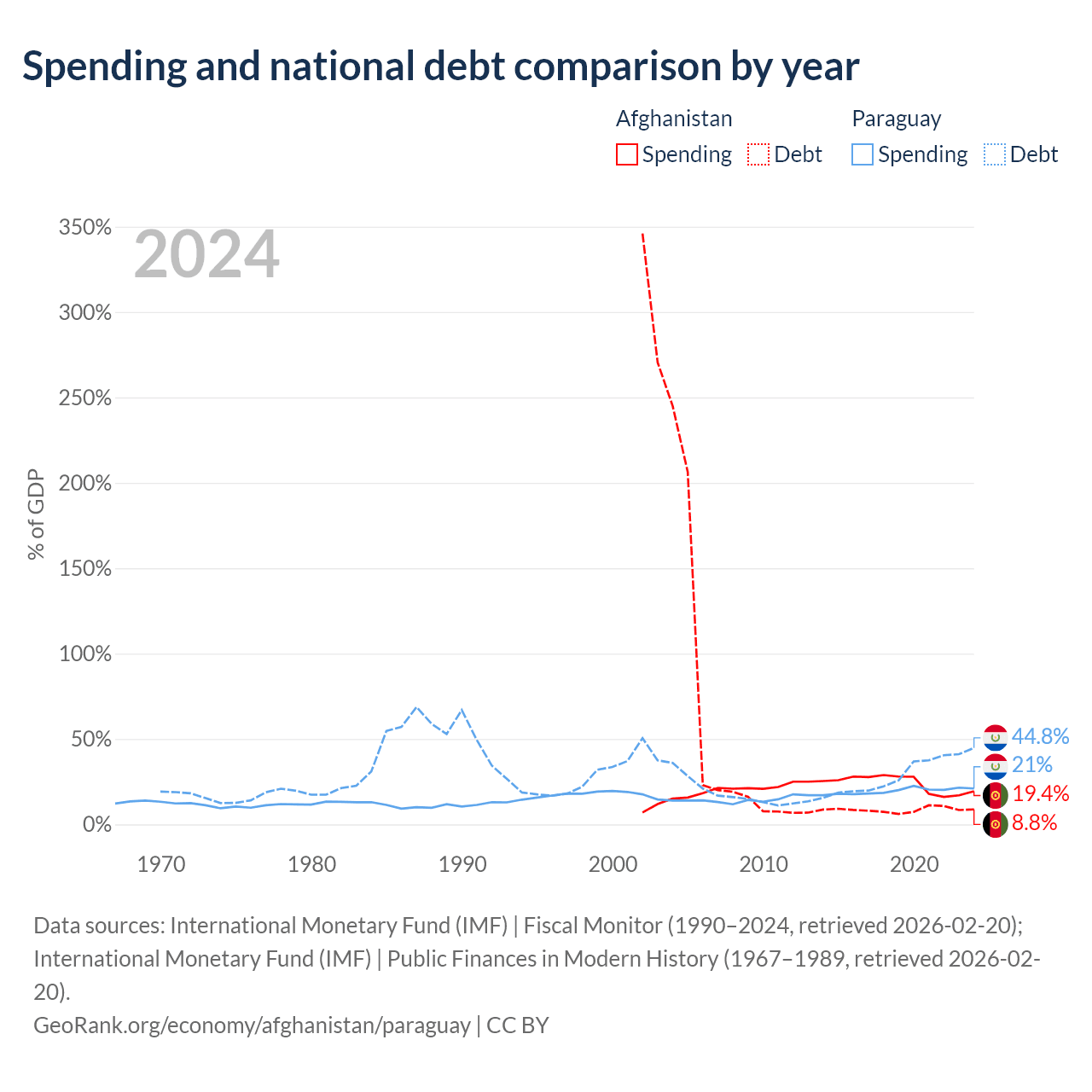 Afghanistan has $1.44B in government debt (8.8% of GDP), compared to $19.9B (44.8% of GDP) in Paraguay.
