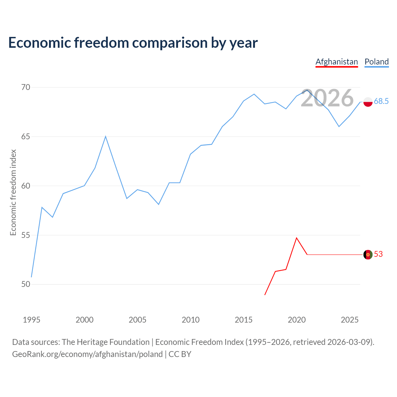 The Economic Freedom Index for Afghanistan is 53, ranking 142/197, compared to 68.5 for Poland, ranking 46/197. The chart above displays a comparison of annual changes in economic freedom indexes.