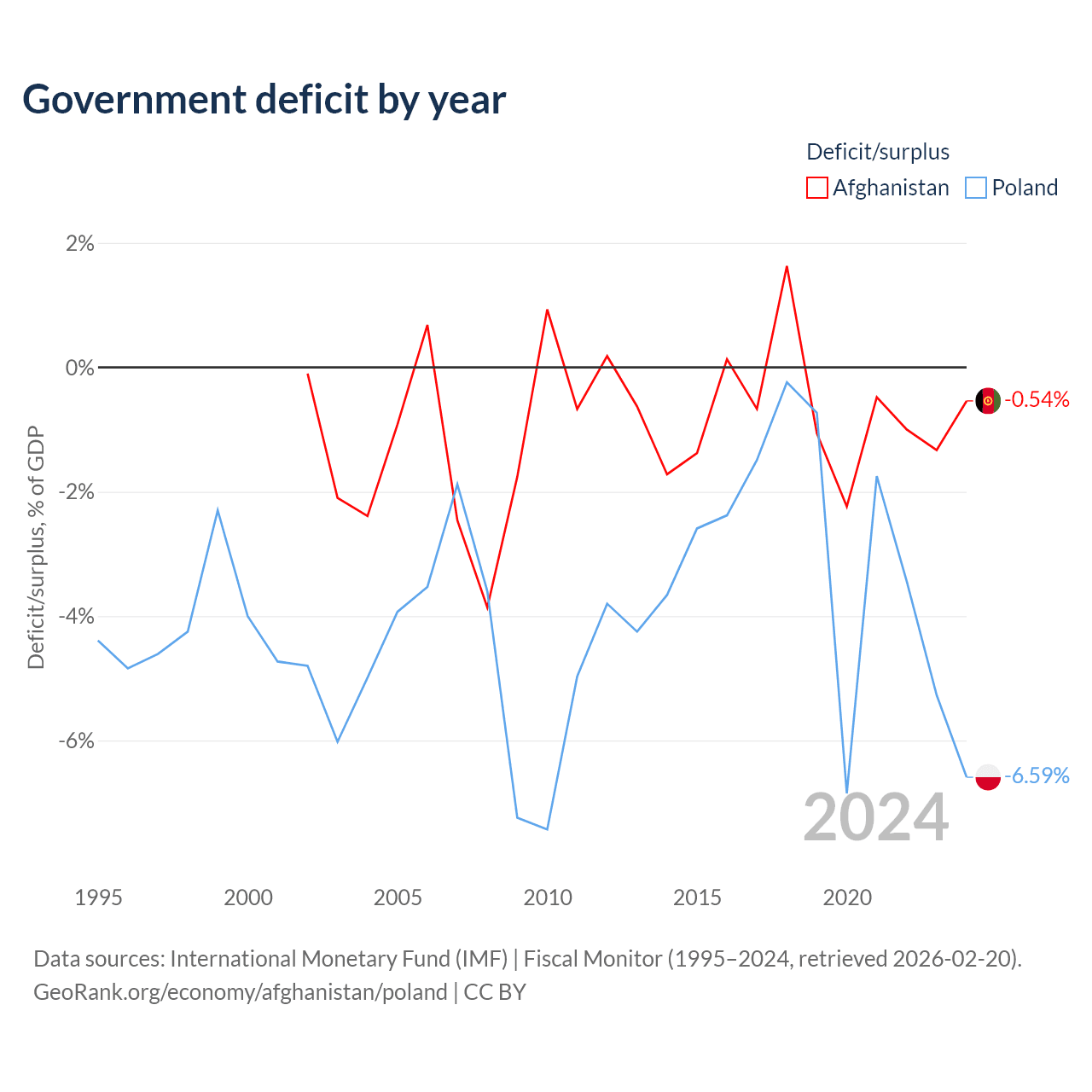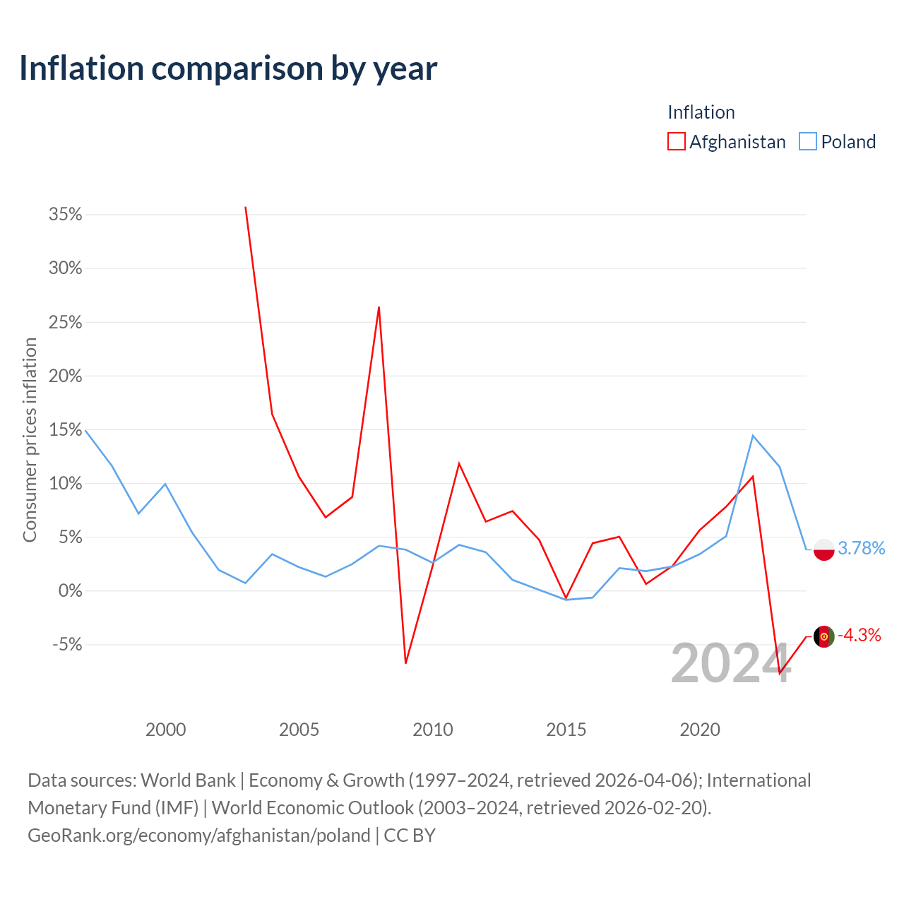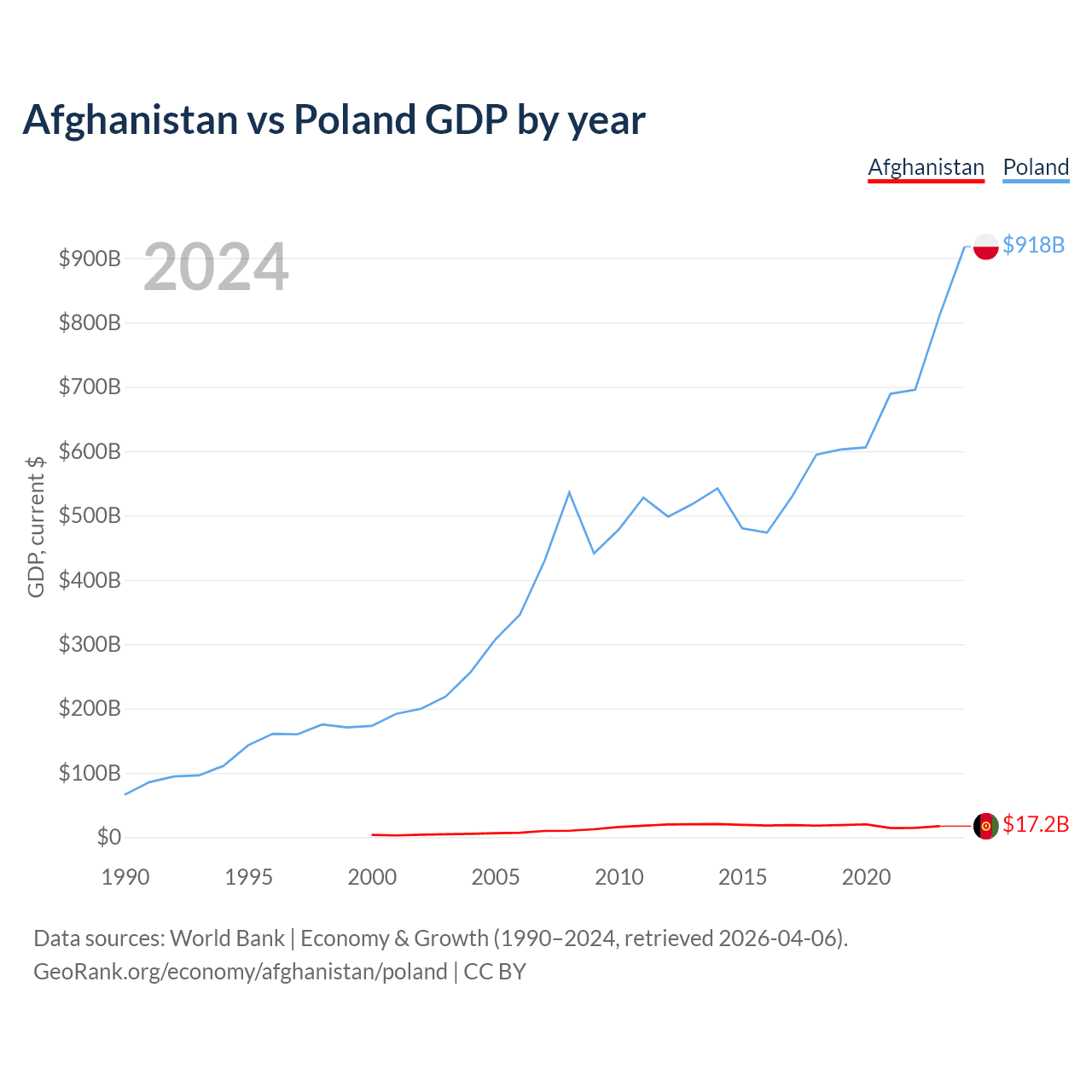Afghanistan has a GDP of $17.2B compared to $918B for Poland, ranking 137/197 and 21/197 by economy size, respectively.