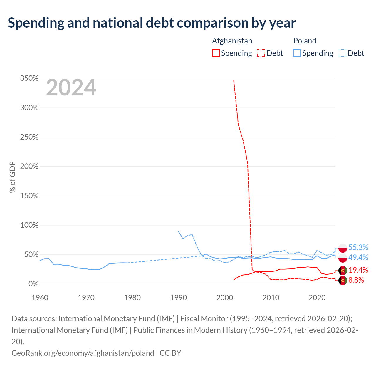 Afghanistan has $1.44B in government debt (8.8% of GDP), compared to $507B (55.3% of GDP) in Poland.