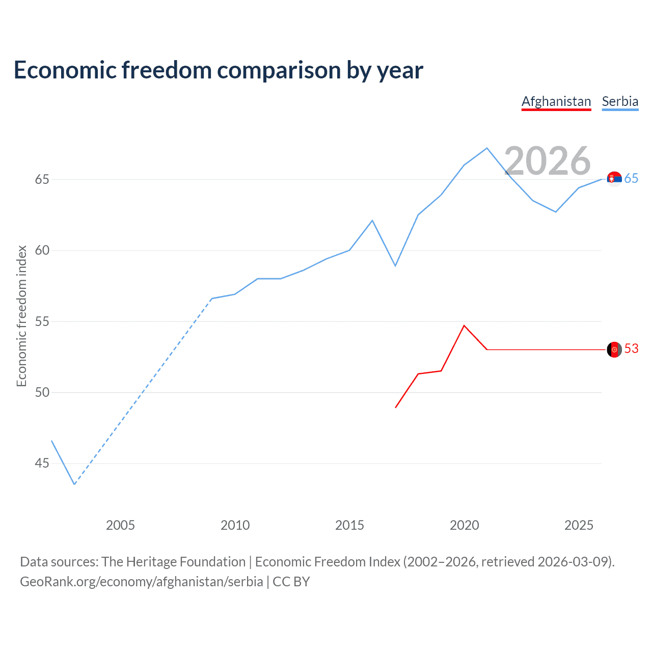 The Economic Freedom Index for Afghanistan is 53, ranking 142/197, compared to 65 for Serbia, ranking 68/197. The chart above displays a comparison of annual changes in economic freedom indexes.