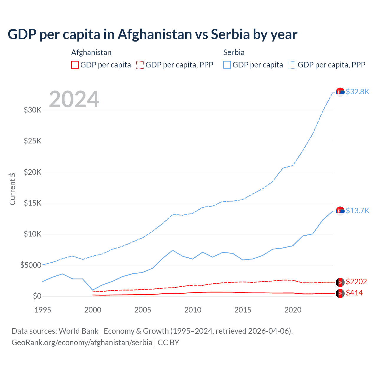 GDP per capita in Afghanistan vs Serbia by year