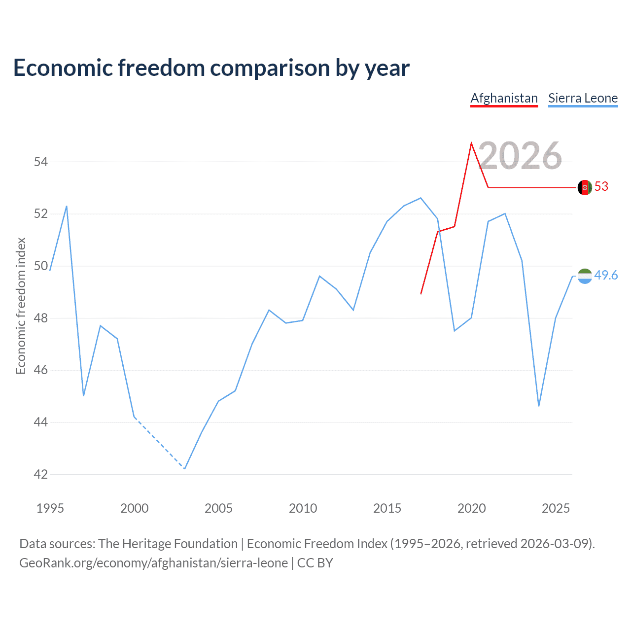 The Economic Freedom Index for Afghanistan is 53, ranking 142/197, compared to 49.6 for Sierra Leone, ranking 165/197. The chart above displays a comparison of annual changes in economic freedom indexes.