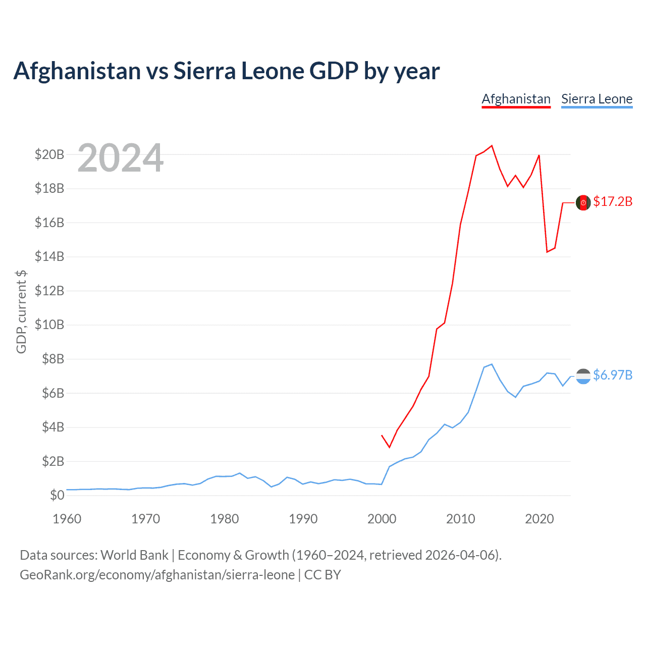 Afghanistan has a GDP of $17.2B compared to $6.97B for Sierra Leone, ranking 137/197 and 160/197 by economy size, respectively.