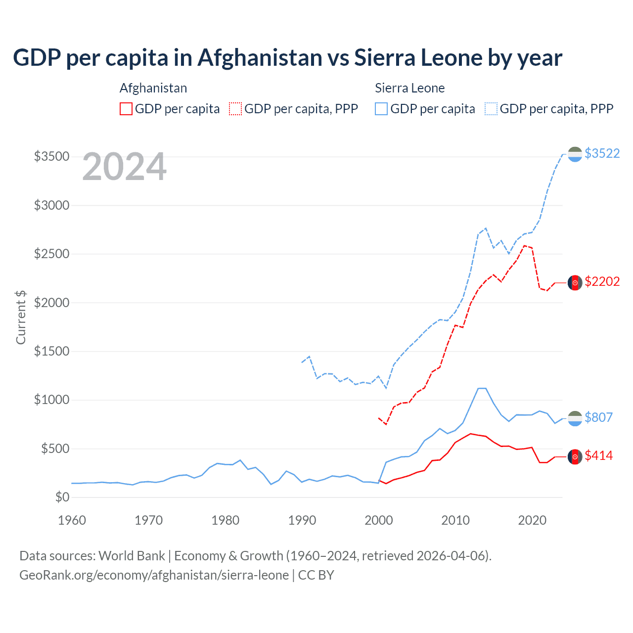 GDP per capita in Afghanistan vs Sierra Leone by year