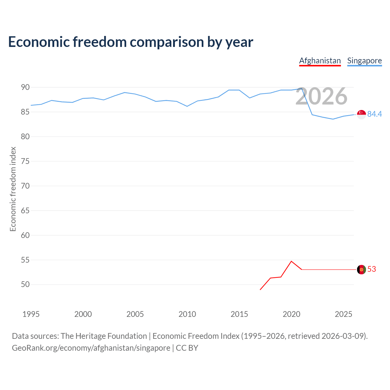 The Economic Freedom Index for Afghanistan is 53, ranking 142/197, compared to 84.4 for Singapore, ranking 1/197. The chart above displays a comparison of annual changes in economic freedom indexes.
