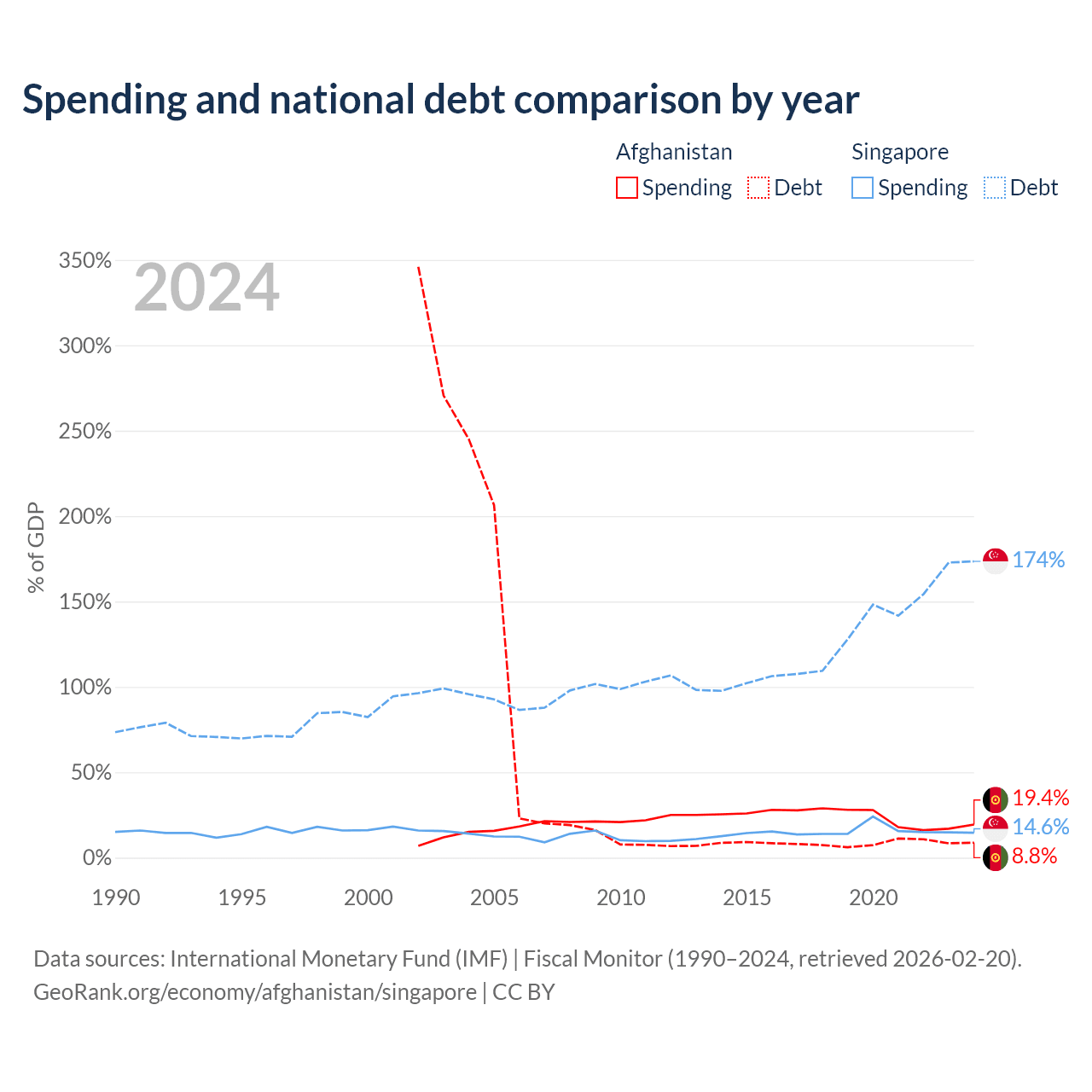 Afghanistan has $1.44B in government debt (8.8% of GDP), compared to $950B (173.5% of GDP) in Singapore.