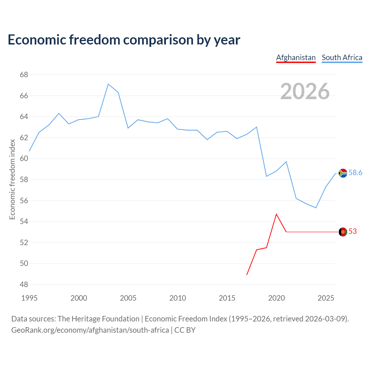 The Economic Freedom Index for Afghanistan is 53, ranking 142/197, compared to 58.6 for South Africa, ranking 110/197. The chart above displays a comparison of annual changes in economic freedom indexes.