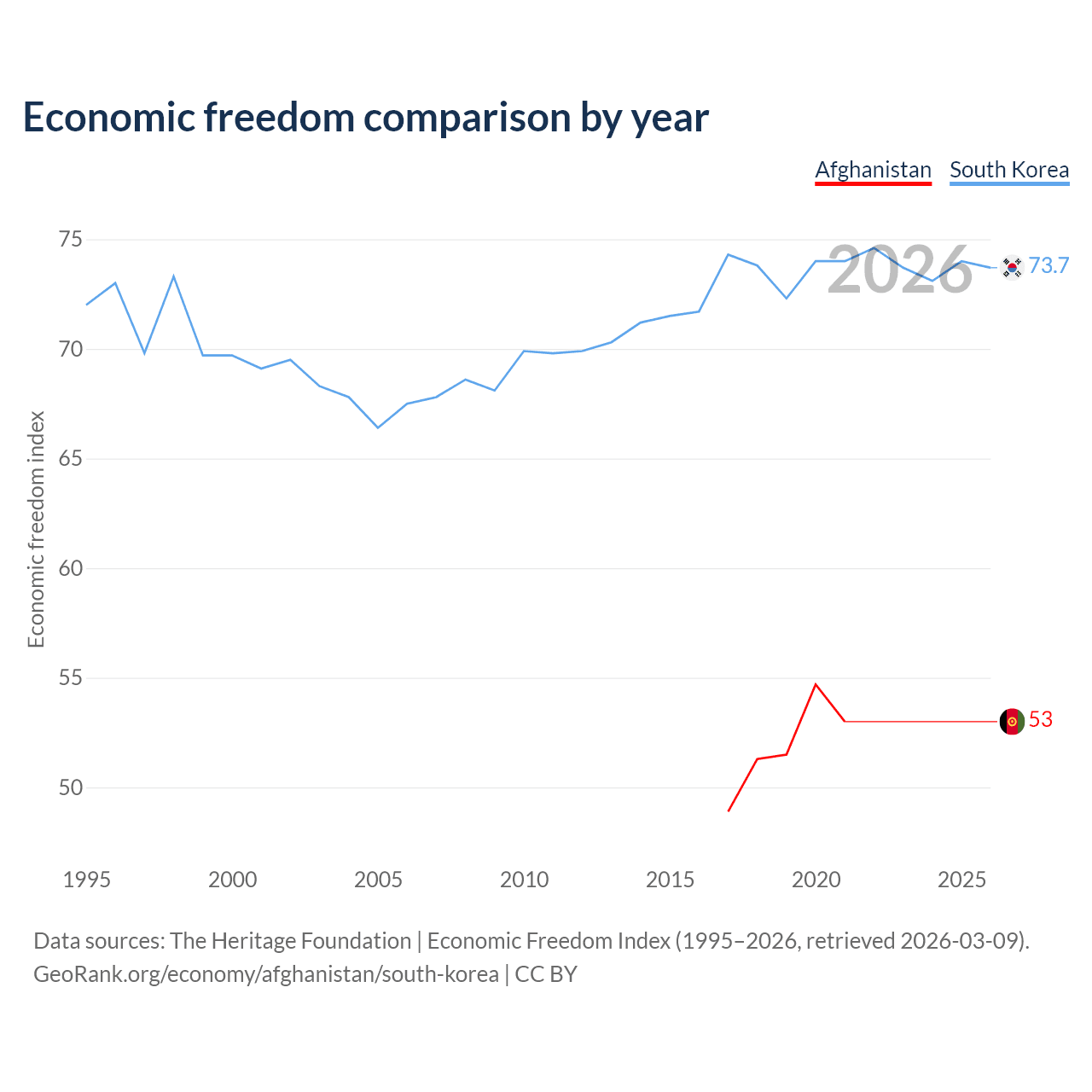 The Economic Freedom Index for Afghanistan is 53, ranking 142/197, compared to 73.7 for South Korea, ranking 24/197. The chart above displays a comparison of annual changes in economic freedom indexes.