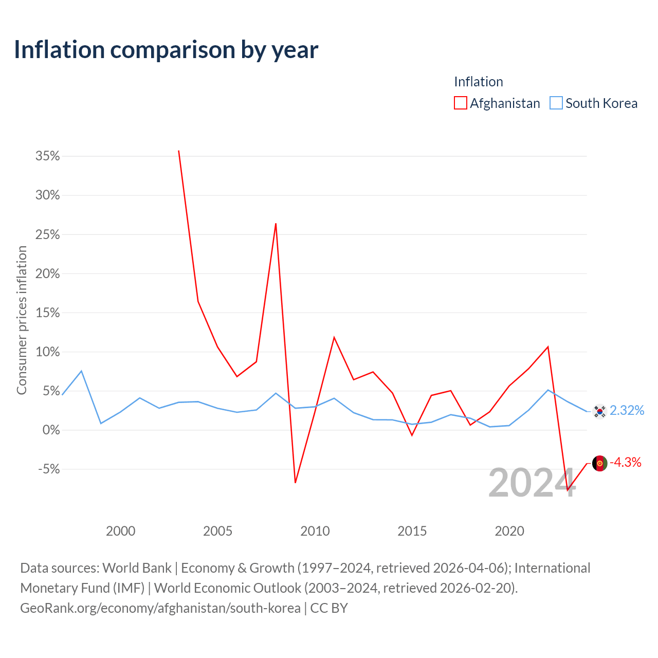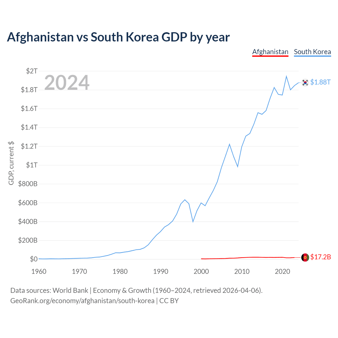 Afghanistan has a GDP of $17.2B compared to $1.88T for South Korea, ranking 137/197 and 12/197 by economy size, respectively.