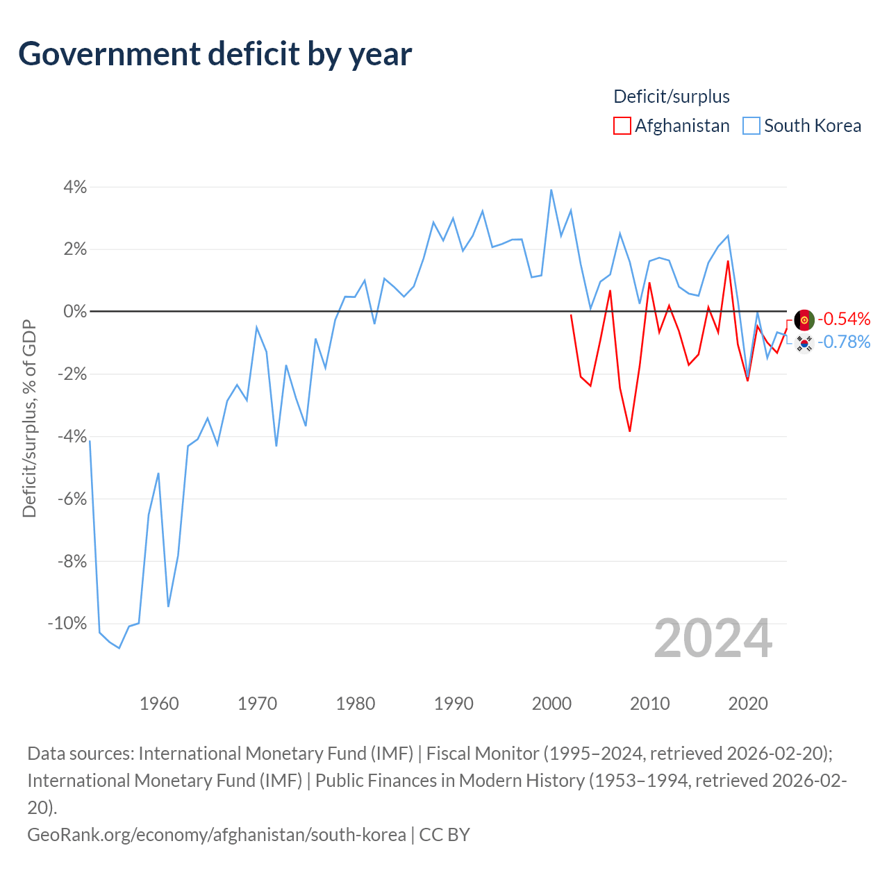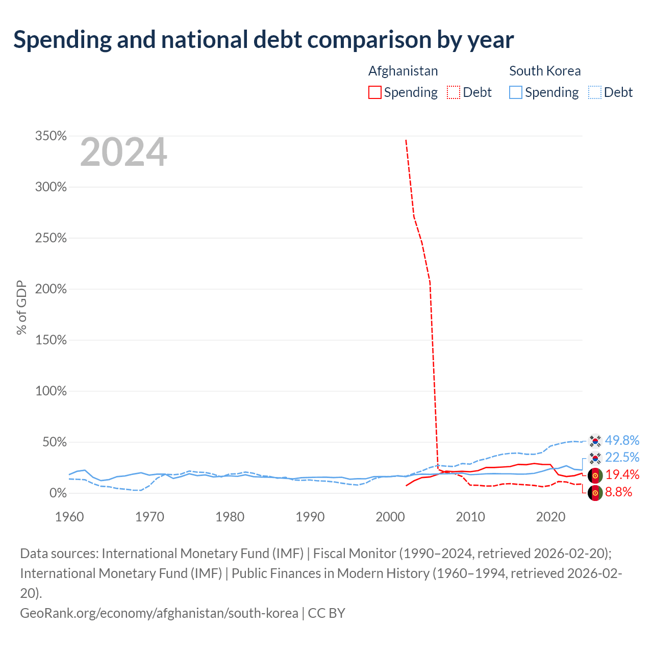 Afghanistan has $1.44B in government debt (8.8% of GDP), compared to $934B (49.8% of GDP) in South Korea.