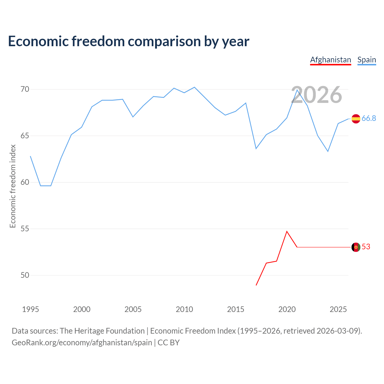 The Economic Freedom Index for Afghanistan is 53, ranking 142/197, compared to 66.8 for Spain, ranking 59/197. The chart above displays a comparison of annual changes in economic freedom indexes.