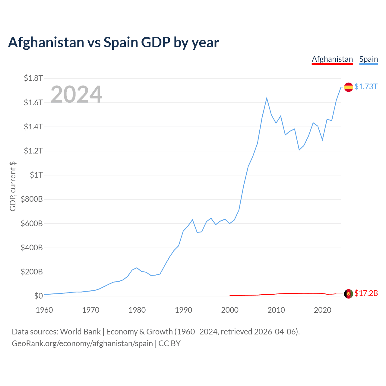 Afghanistan has a GDP of $17.2B compared to $1.73T for Spain, ranking 137/197 and 15/197 by economy size, respectively.