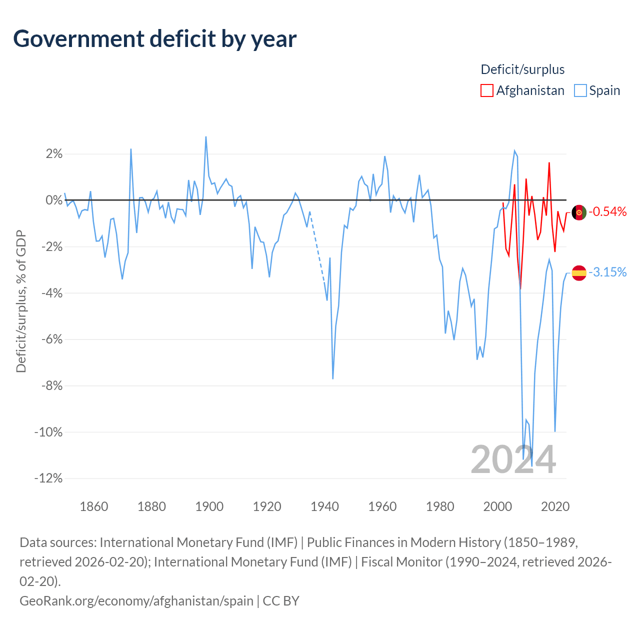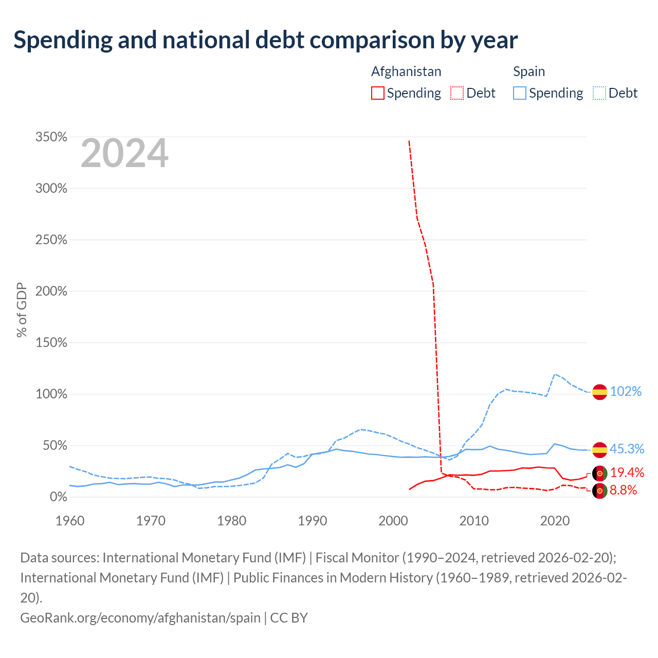 Afghanistan has $1.44B in government debt (8.8% of GDP), compared to $1.75T (101.6% of GDP) in Spain.