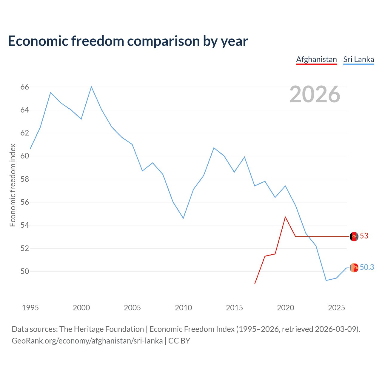 The Economic Freedom Index for Afghanistan is 53, ranking 142/197, compared to 50.3 for Sri Lanka, ranking 162/197. The chart above displays a comparison of annual changes in economic freedom indexes.
