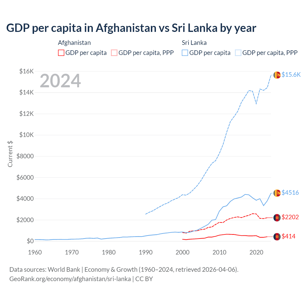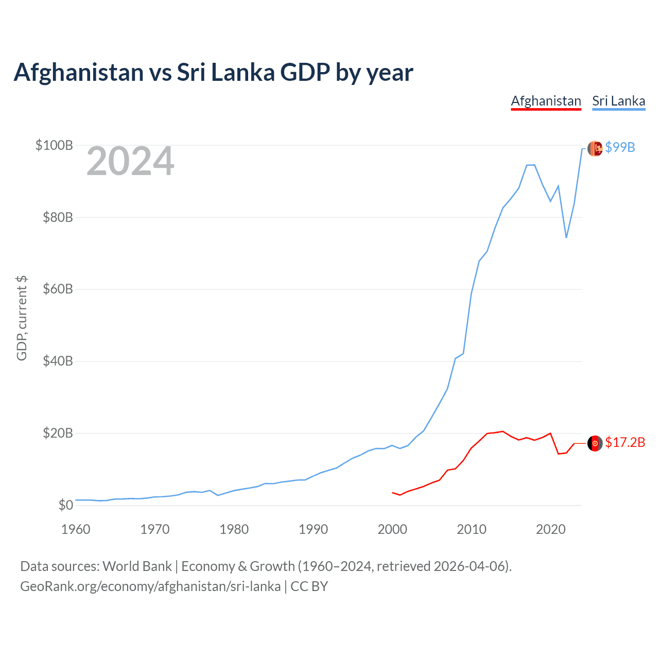 Afghanistan has a GDP of $17.2B compared to $99B for Sri Lanka, ranking 137/197 and 72/197 by economy size, respectively.