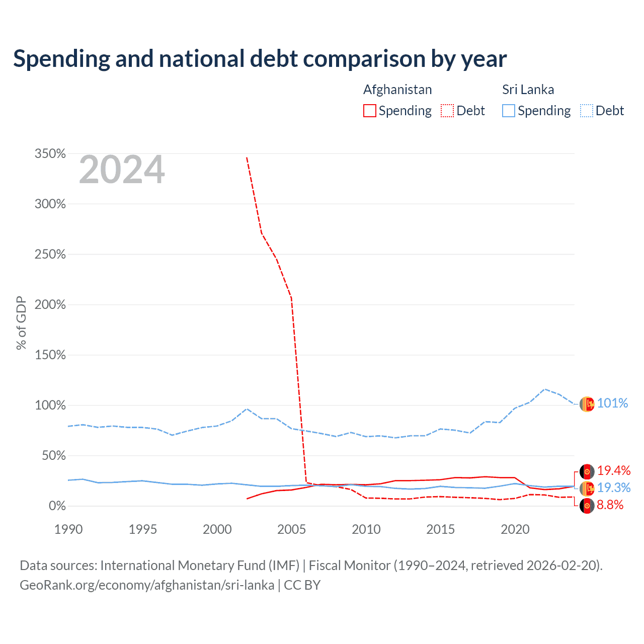 Afghanistan has $1.44B in government debt (8.8% of GDP), compared to $99.8B (100.8% of GDP) in Sri Lanka.
