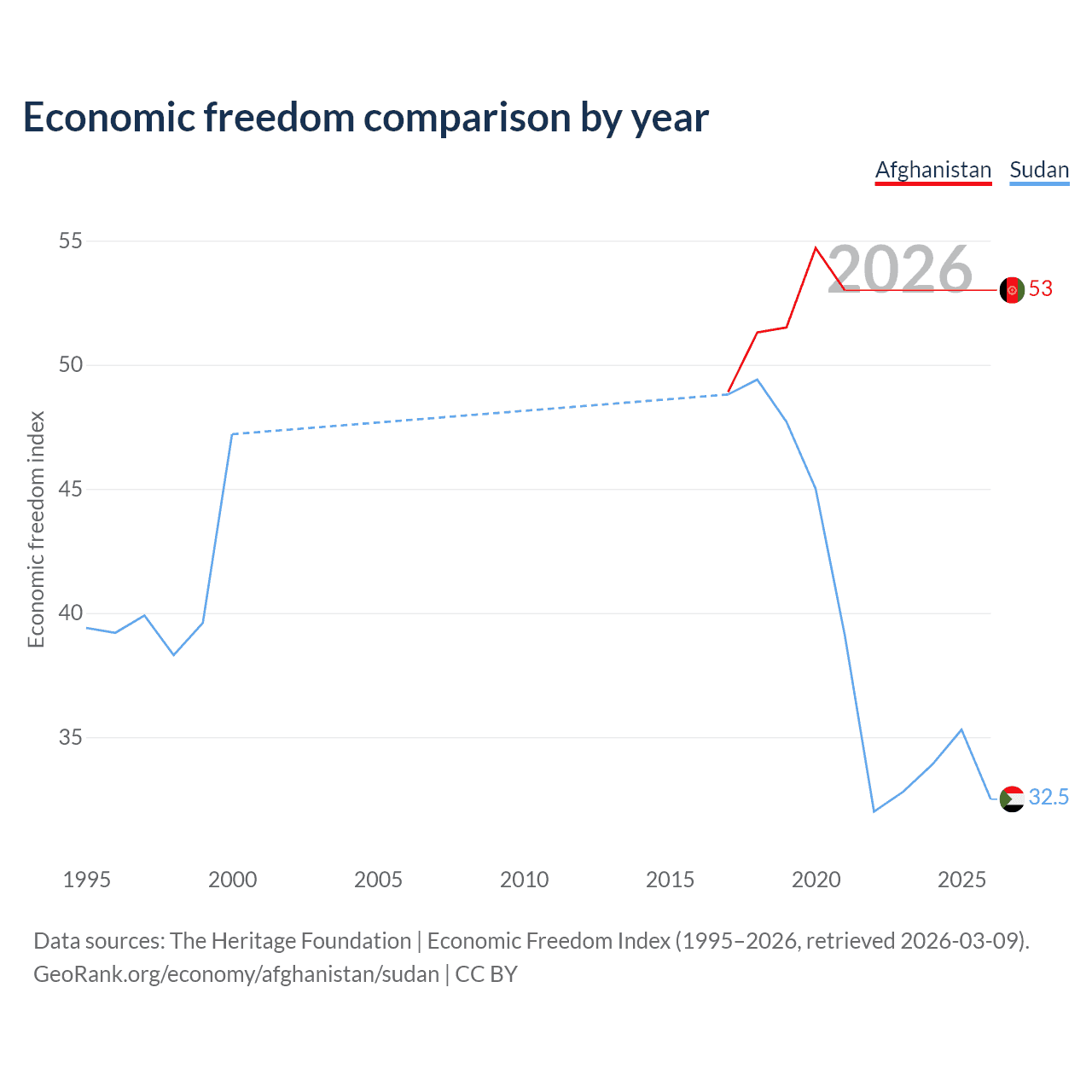 The Economic Freedom Index for Afghanistan is 53, ranking 142/197, compared to 32.5 for Sudan, ranking 191/197. The chart above displays a comparison of annual changes in economic freedom indexes.