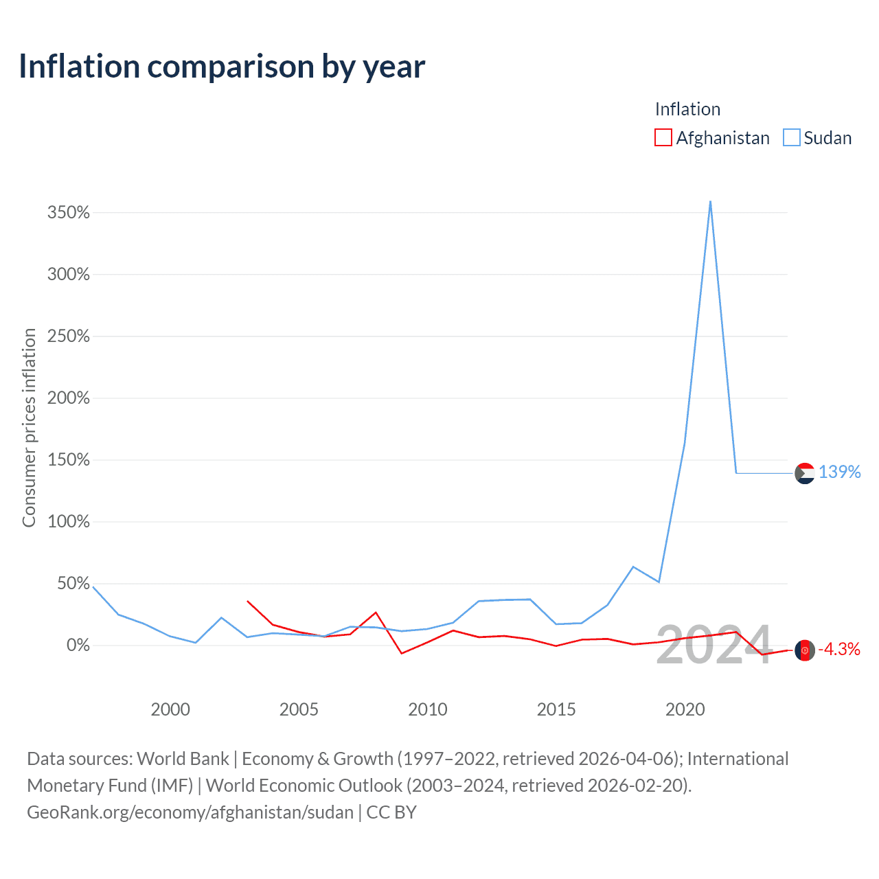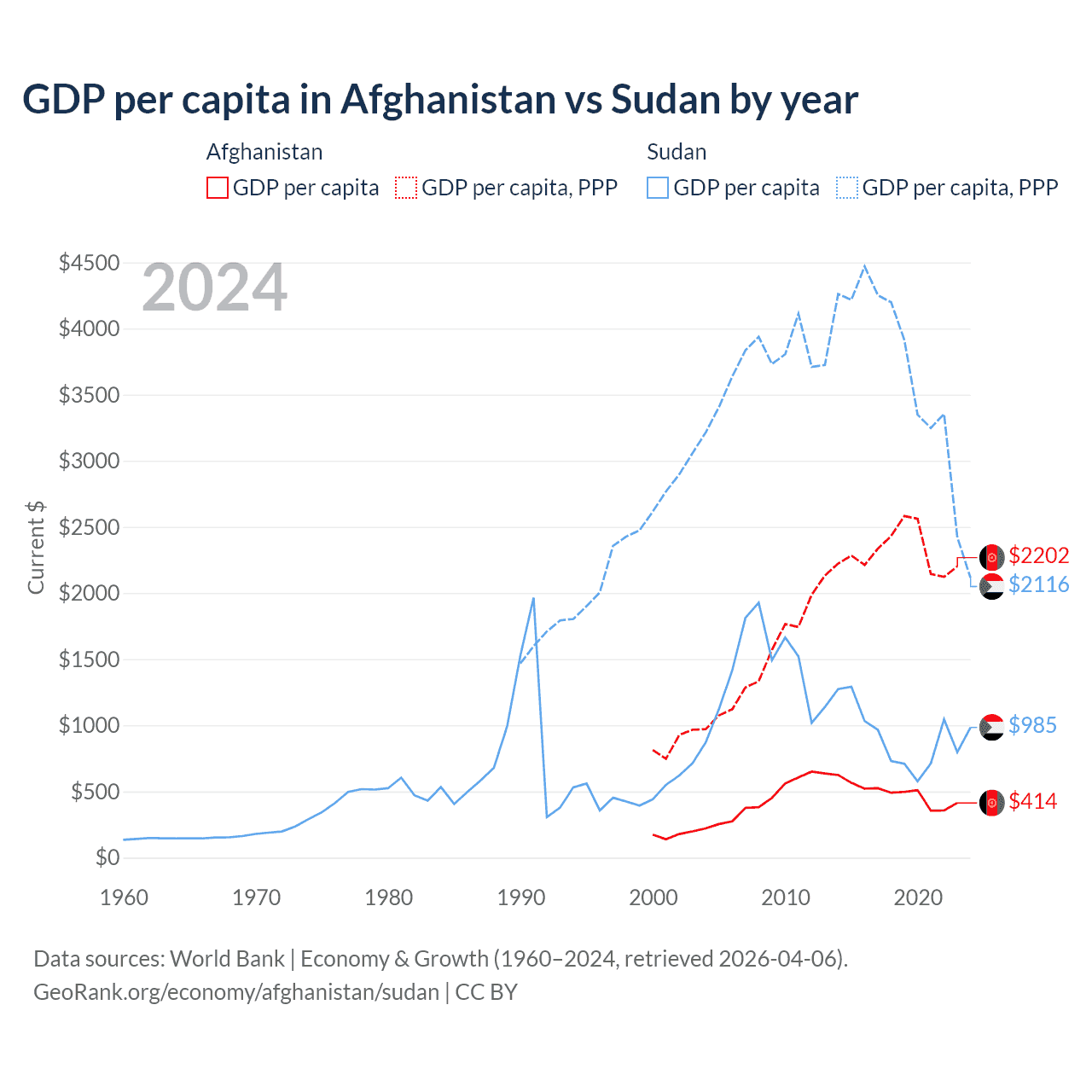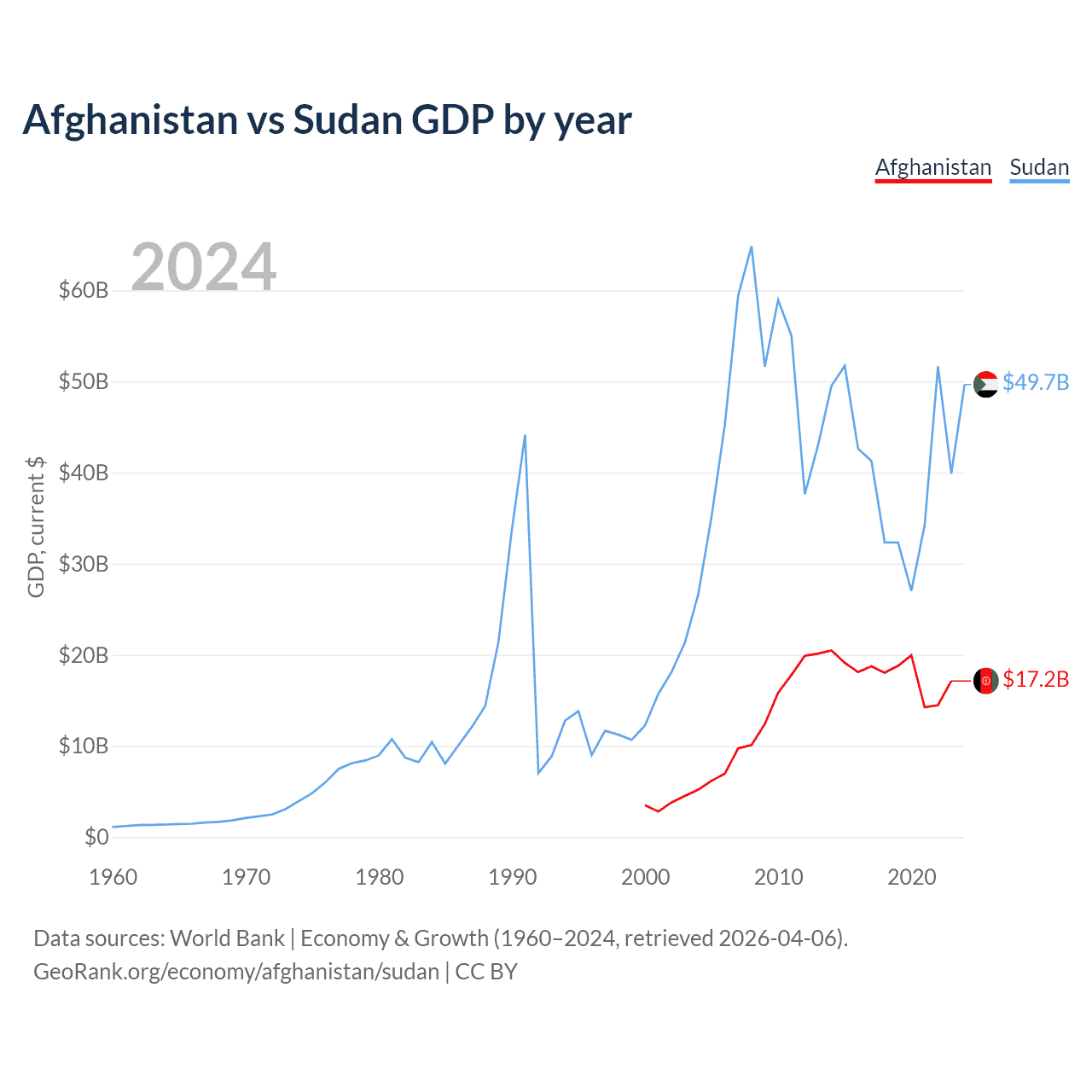 Afghanistan has a GDP of $17.2B compared to $49.7B for Sudan, ranking 137/197 and 94/197 by economy size, respectively.