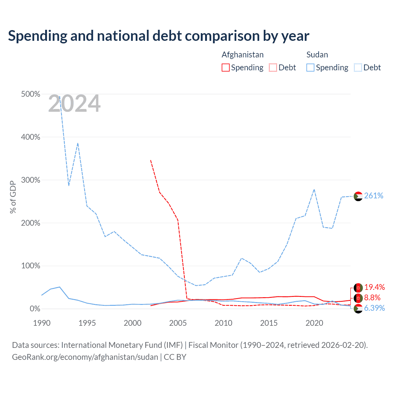 Afghanistan has $1.44B in government debt (8.8% of GDP), compared to $130B (261.4% of GDP) in Sudan.
