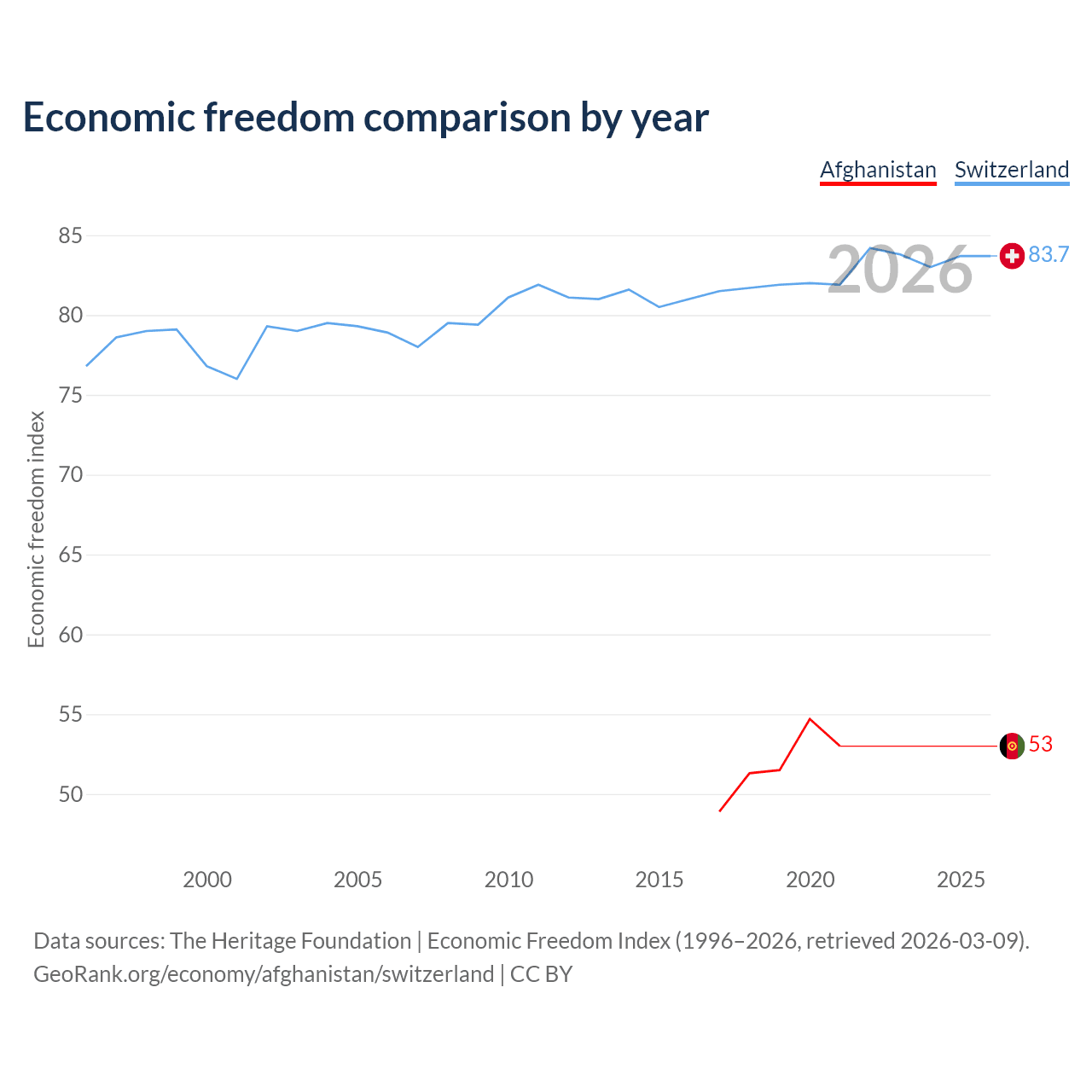 The Economic Freedom Index for Afghanistan is 53, ranking 142/197, compared to 83.7 for Switzerland, ranking 2/197. The chart above displays a comparison of annual changes in economic freedom indexes.