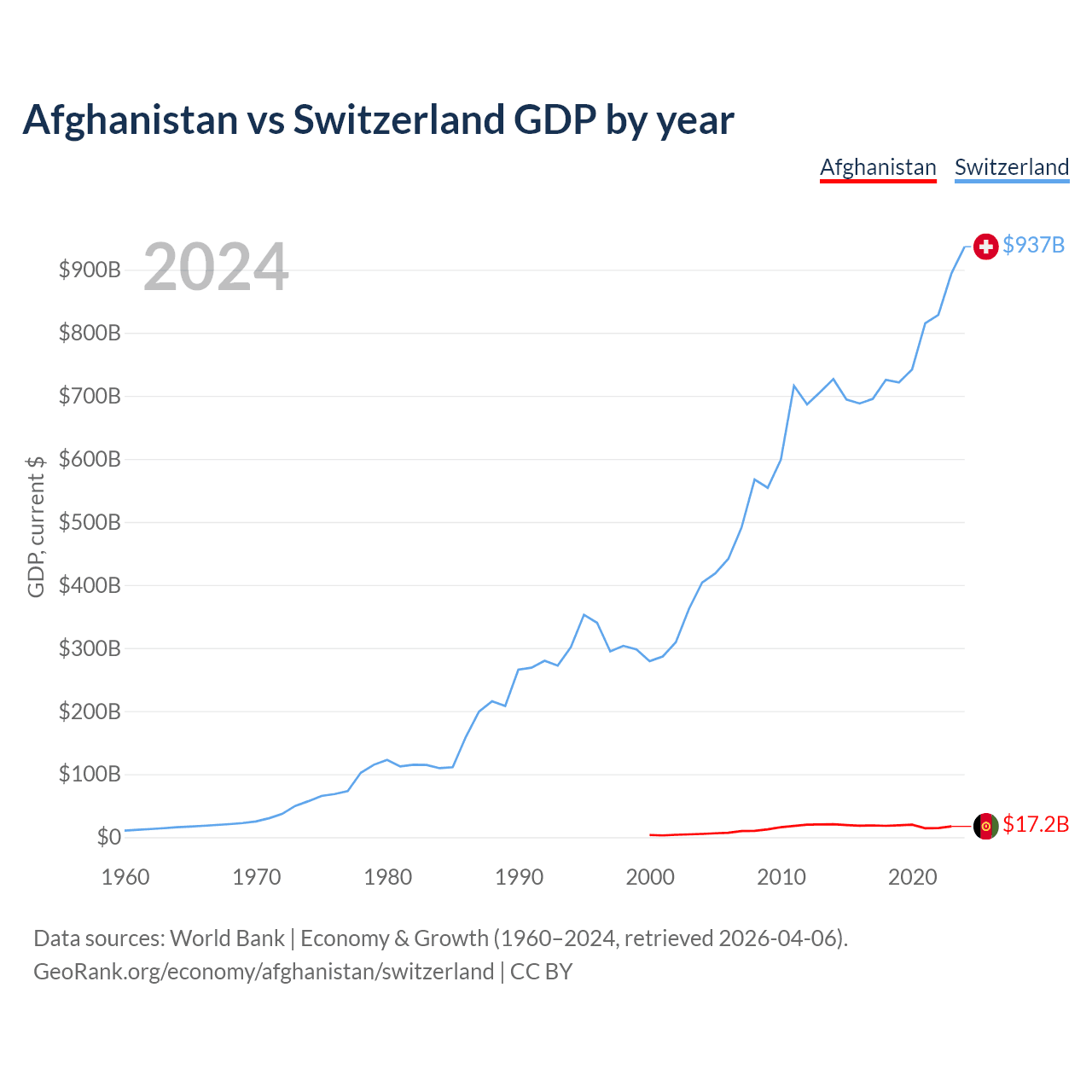 Afghanistan has a GDP of $17.2B compared to $937B for Switzerland, ranking 137/197 and 20/197 by economy size, respectively.