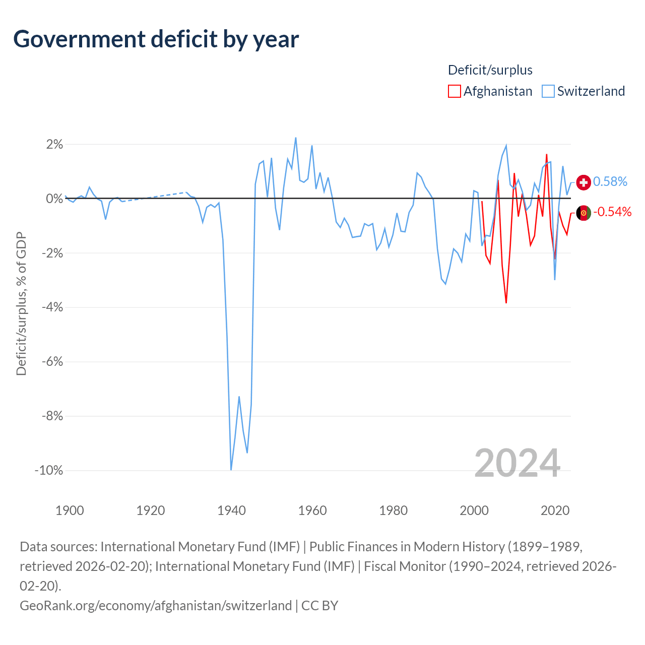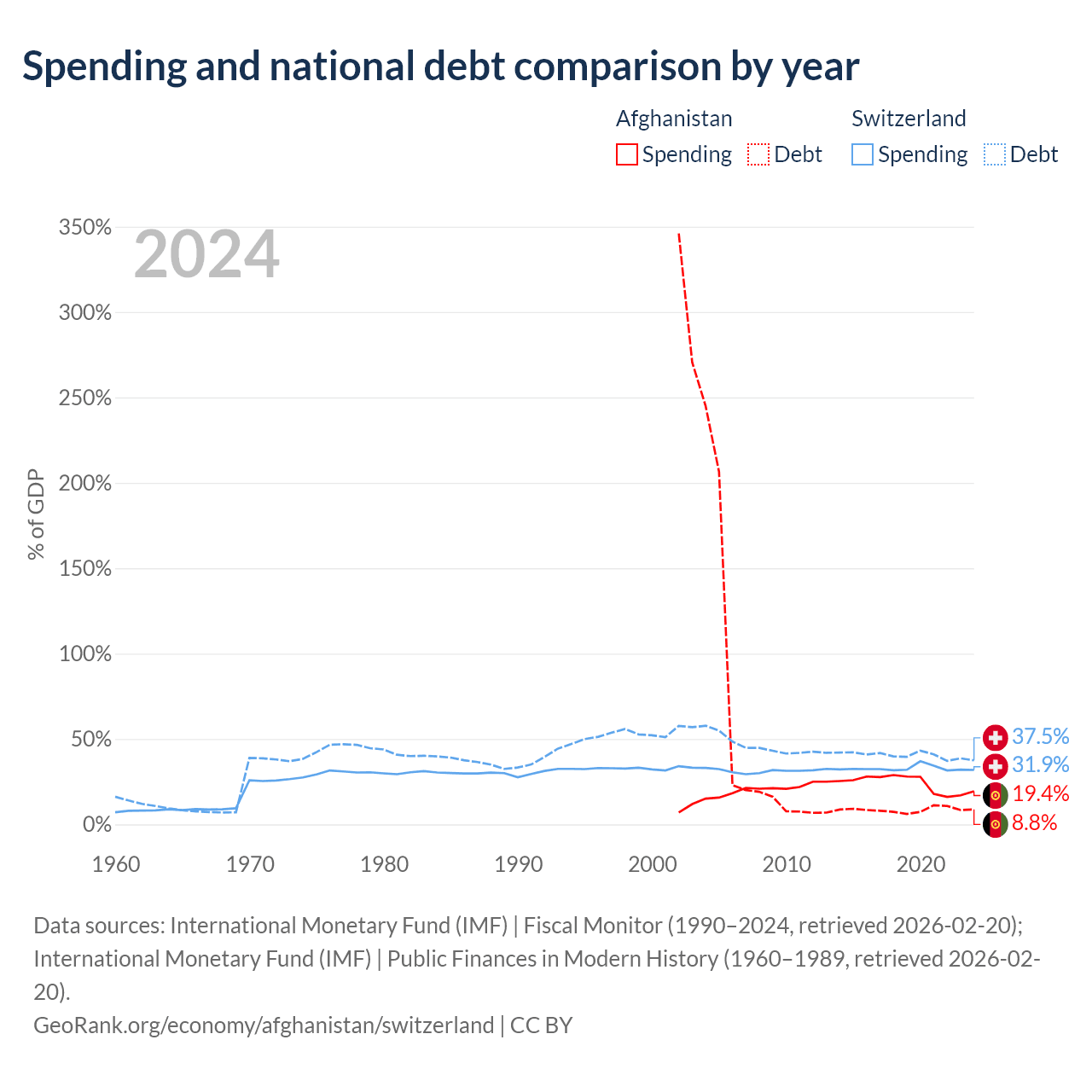 Afghanistan has $1.44B in government debt (8.8% of GDP), compared to $351B (37.5% of GDP) in Switzerland.