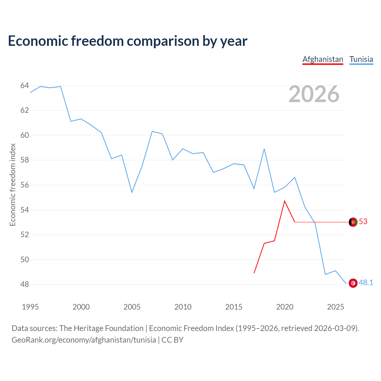 The Economic Freedom Index for Afghanistan is 53, ranking 142/197, compared to 48.1 for Tunisia, ranking 172/197. The chart above displays a comparison of annual changes in economic freedom indexes.