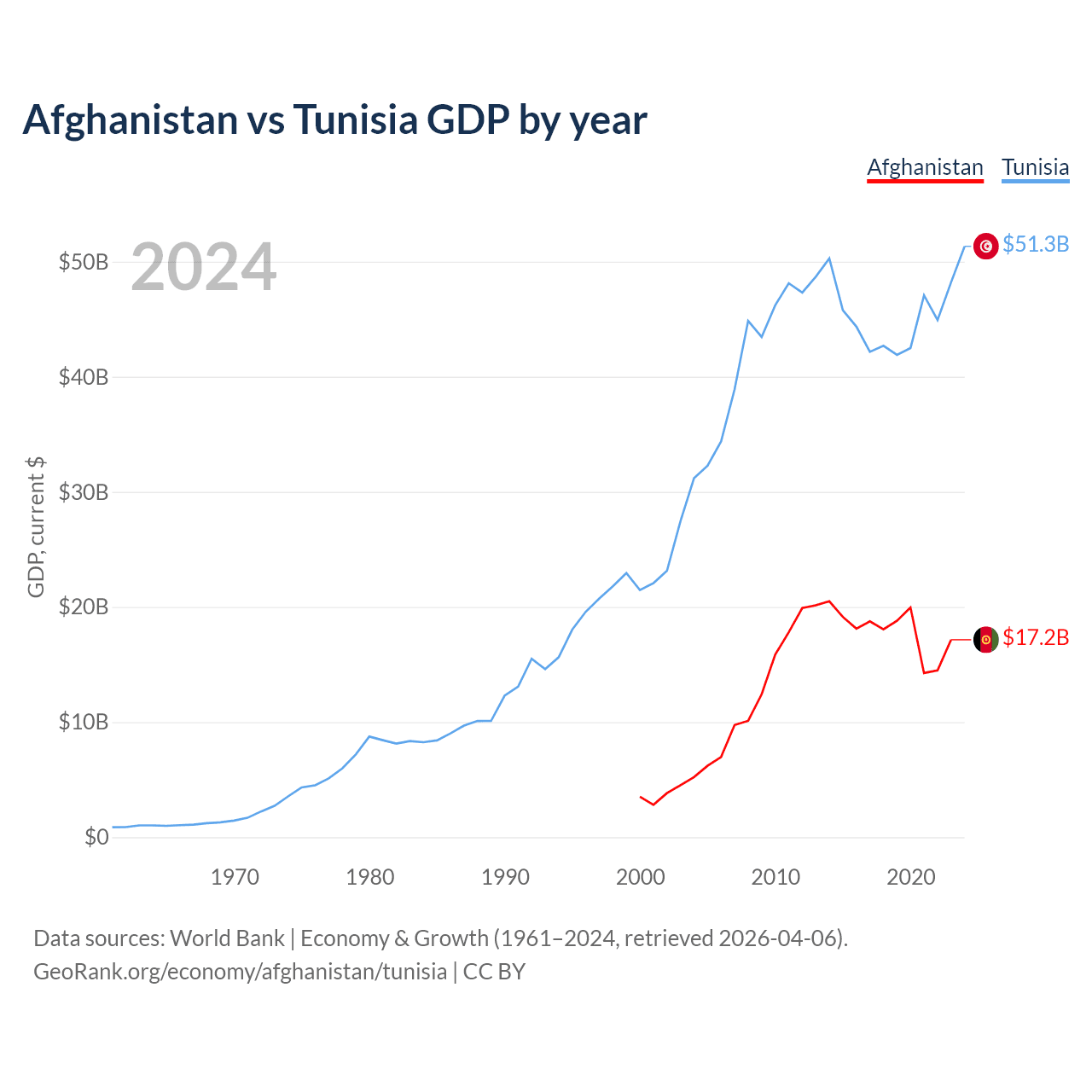 Afghanistan has a GDP of $17.2B compared to $51.3B for Tunisia, ranking 137/197 and 93/197 by economy size, respectively.