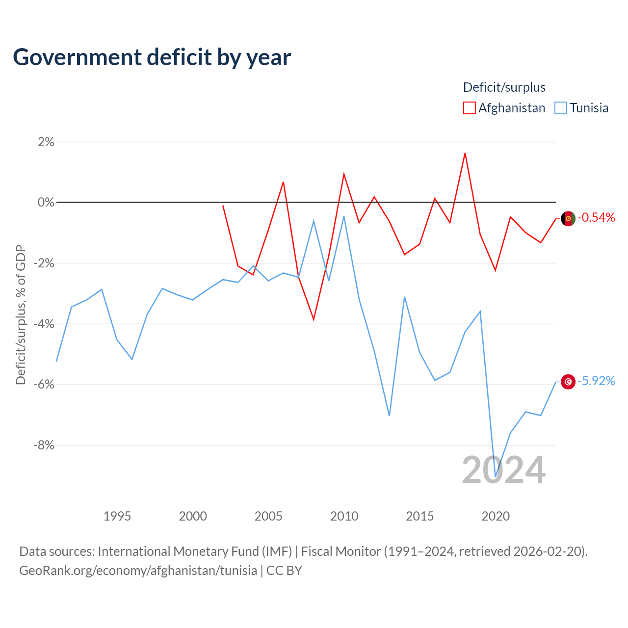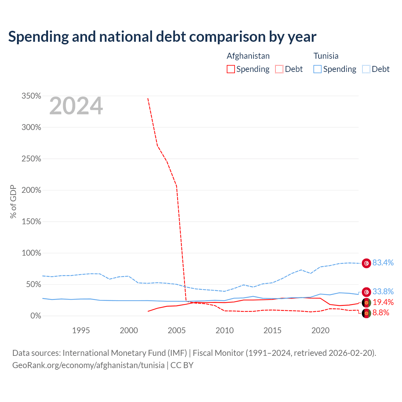 Afghanistan has $1.44B in government debt (8.8% of GDP), compared to $42.8B (83.4% of GDP) in Tunisia.