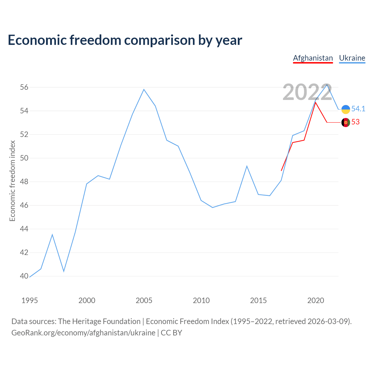 The Economic Freedom Index for Afghanistan is 53, ranking 142/197, compared to 54.1 for Ukraine, ranking 135/197. The chart above displays a comparison of annual changes in economic freedom indexes.