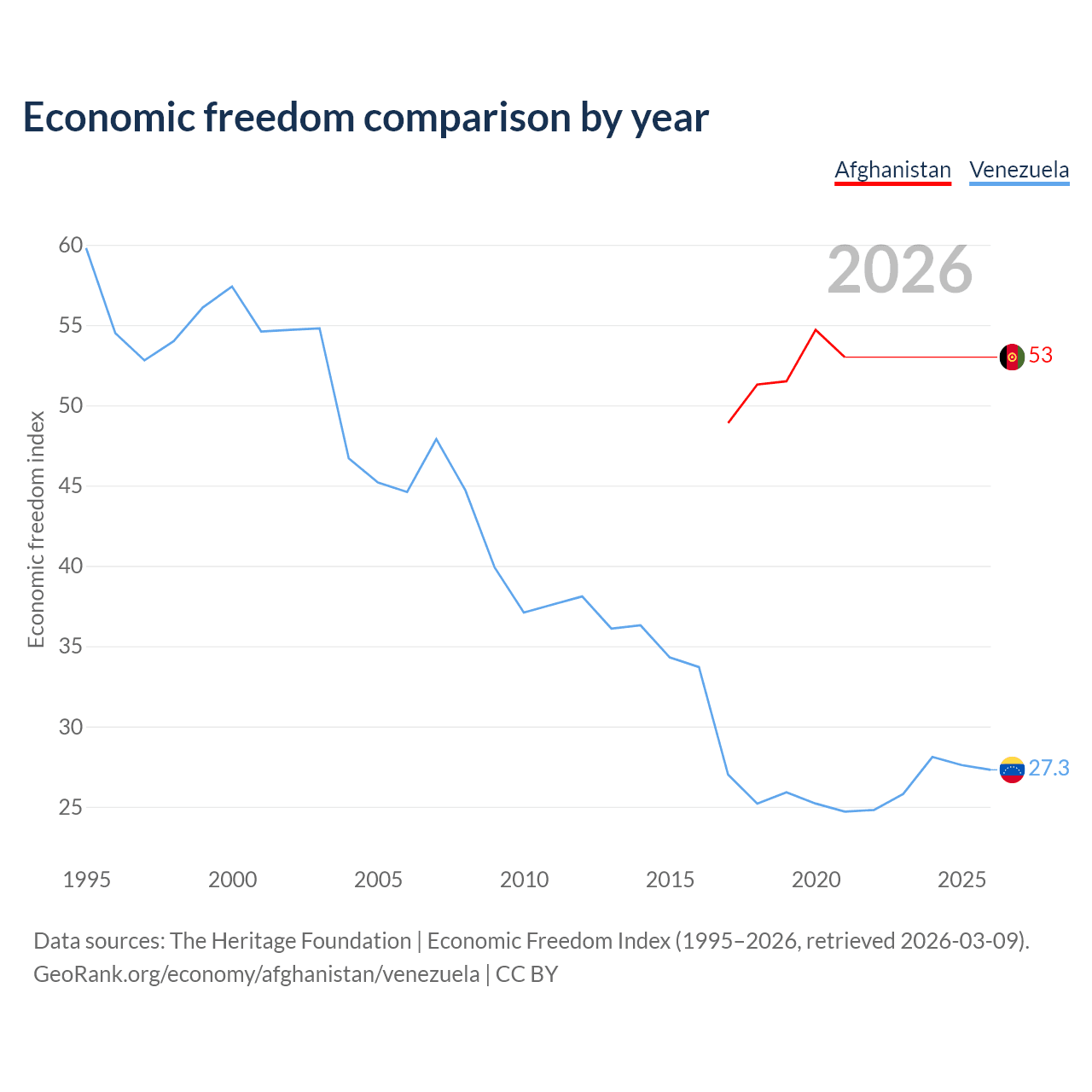 The Economic Freedom Index for Afghanistan is 53, ranking 142/197, compared to 27.3 for Venezuela, ranking 194/197. The chart above displays a comparison of annual changes in economic freedom indexes.