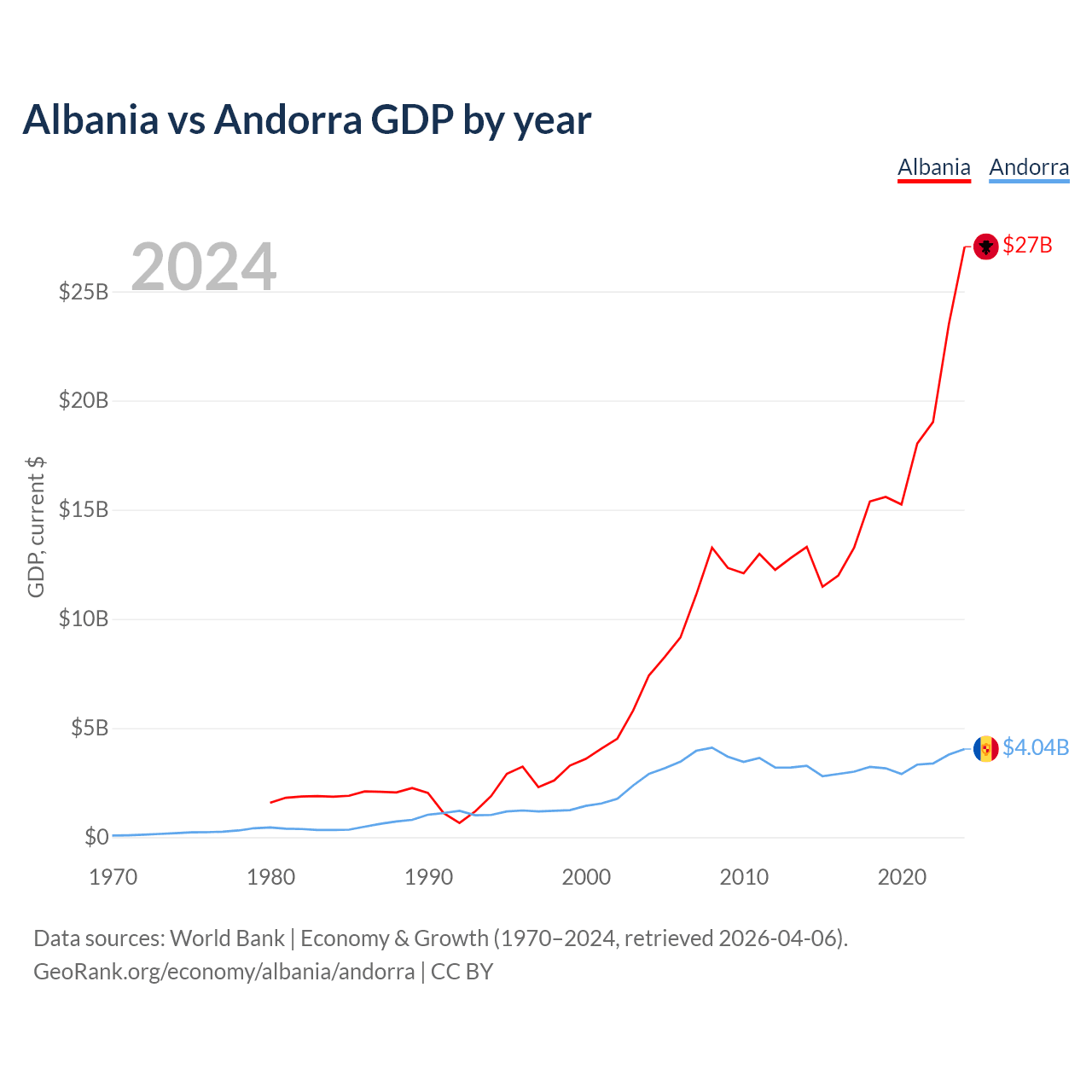 Albania has a GDP of $27B compared to $4.04B for Andorra, ranking 112/197 and 166/197 by economy size, respectively.
